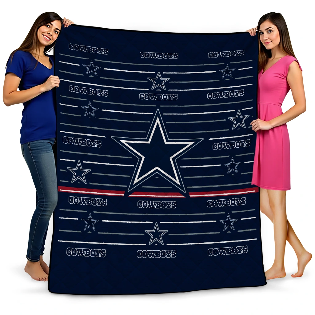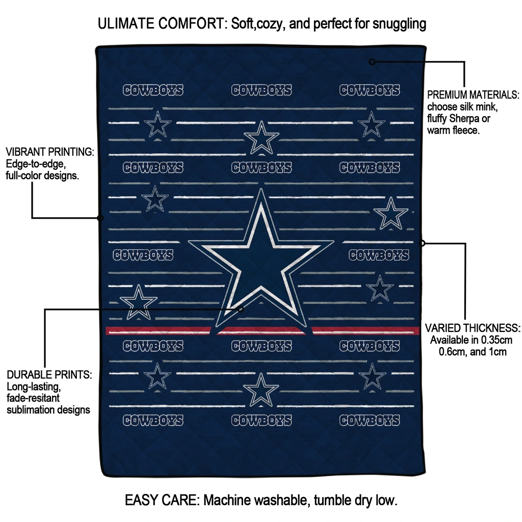 Wrap yourself in warmth and pride with the Dallas Cowboys Handdrawn Stripes Blue Quilt Blanket from the Dallas Cowboys Blankets collection at Yes That Blanket. Made from 100% premium quilting-weight polyester blended with a touch of microfiber, this quilt offers a smooth, soft finish you’ll love. Choose between two quilting styles—Stipple or Diagonal—and enjoy the comfort of a cotton-filled layer inside that adds extra coziness for every season. The border is available in classic black or white, giving your design a clean, timeless edge.