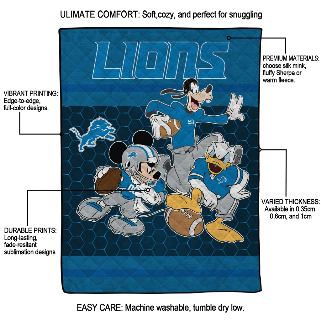 Wrap yourself in warmth and pride with the Detroit Lions Disney Football Blue Quilt Blanket from the Detroit Lions Blankets collection at Yes That Blanket. Made from 100% premium quilting-weight polyester blended with a touch of microfiber, this quilt offers a smooth, soft finish you’ll love. Choose between two quilting styles—Stipple or Diagonal—and enjoy the comfort of a cotton-filled layer inside that adds extra coziness for every season. The border is available in classic black or white, giving your design a clean, timeless edge.