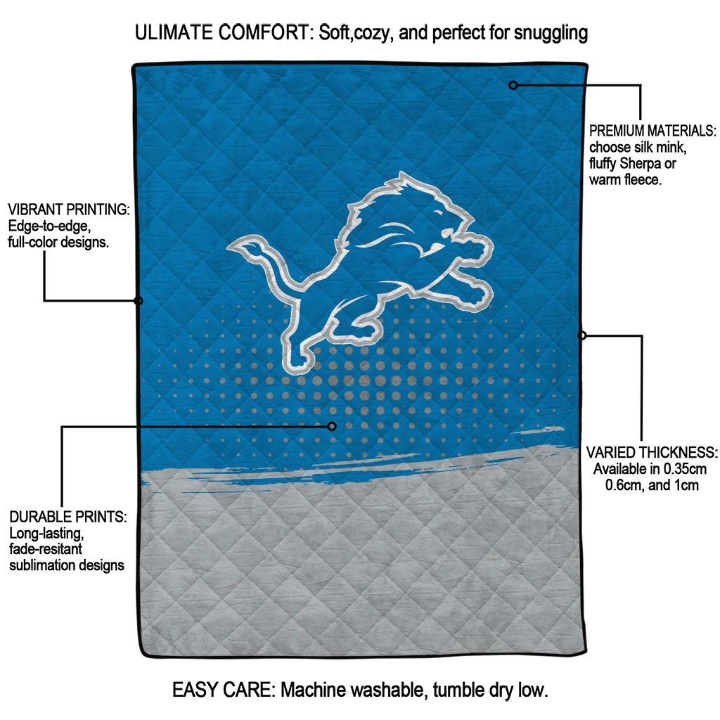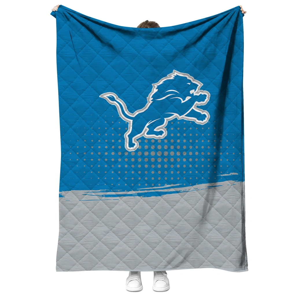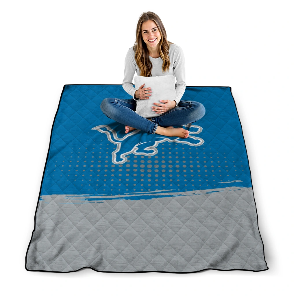 Wrap yourself in warmth and pride with the Detroit Lions Dot Illusion Blue Quilt Blanket from the Detroit Lions Blankets collection at Yes That Blanket. Made from 100% premium quilting-weight polyester blended with a touch of microfiber, this quilt offers a smooth, soft finish you’ll love. Choose between two quilting styles—Stipple or Diagonal—and enjoy the comfort of a cotton-filled layer inside that adds extra coziness for every season. The border is available in classic black or white, giving your design a clean, timeless edge.