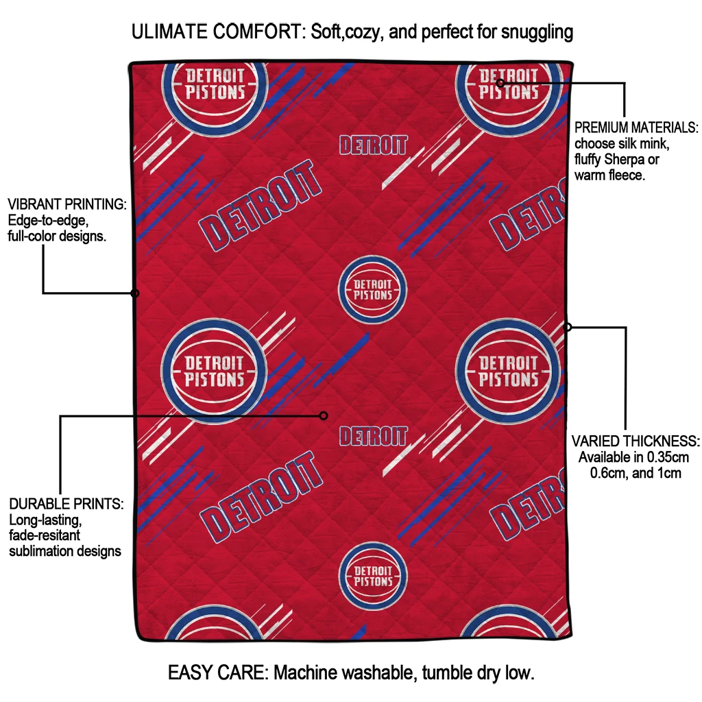 The Detroit Pistons Sketch Lines Red Quilt Blanket is more than a blanket—it’s everyday comfort, thoughtfully made. Crafted from premium quilting fabric with a soft microfiber touch, it offers a smooth hand-feel and lasting coziness. Layered quilting with a cotton-filled core provides adaptable warmth across seasons while maintaining a clean, tailored look on your bed or sofa.