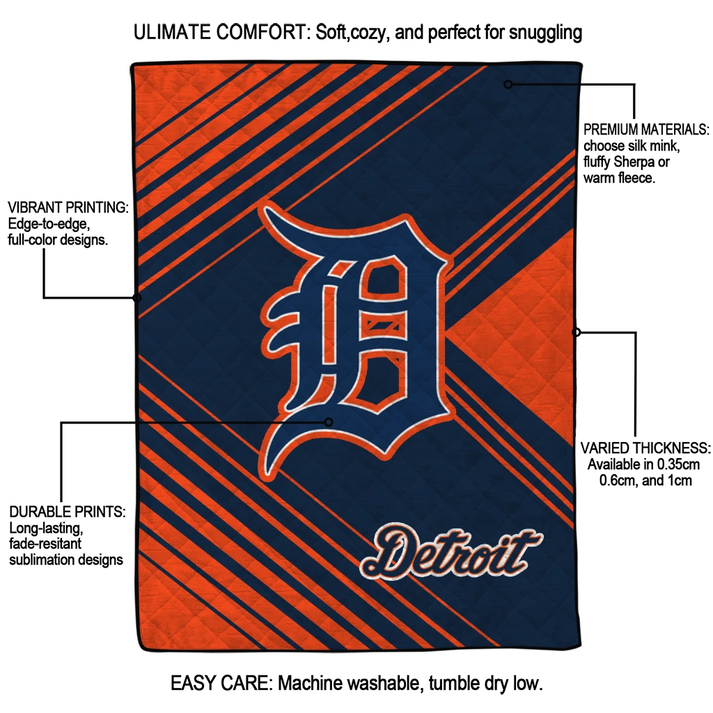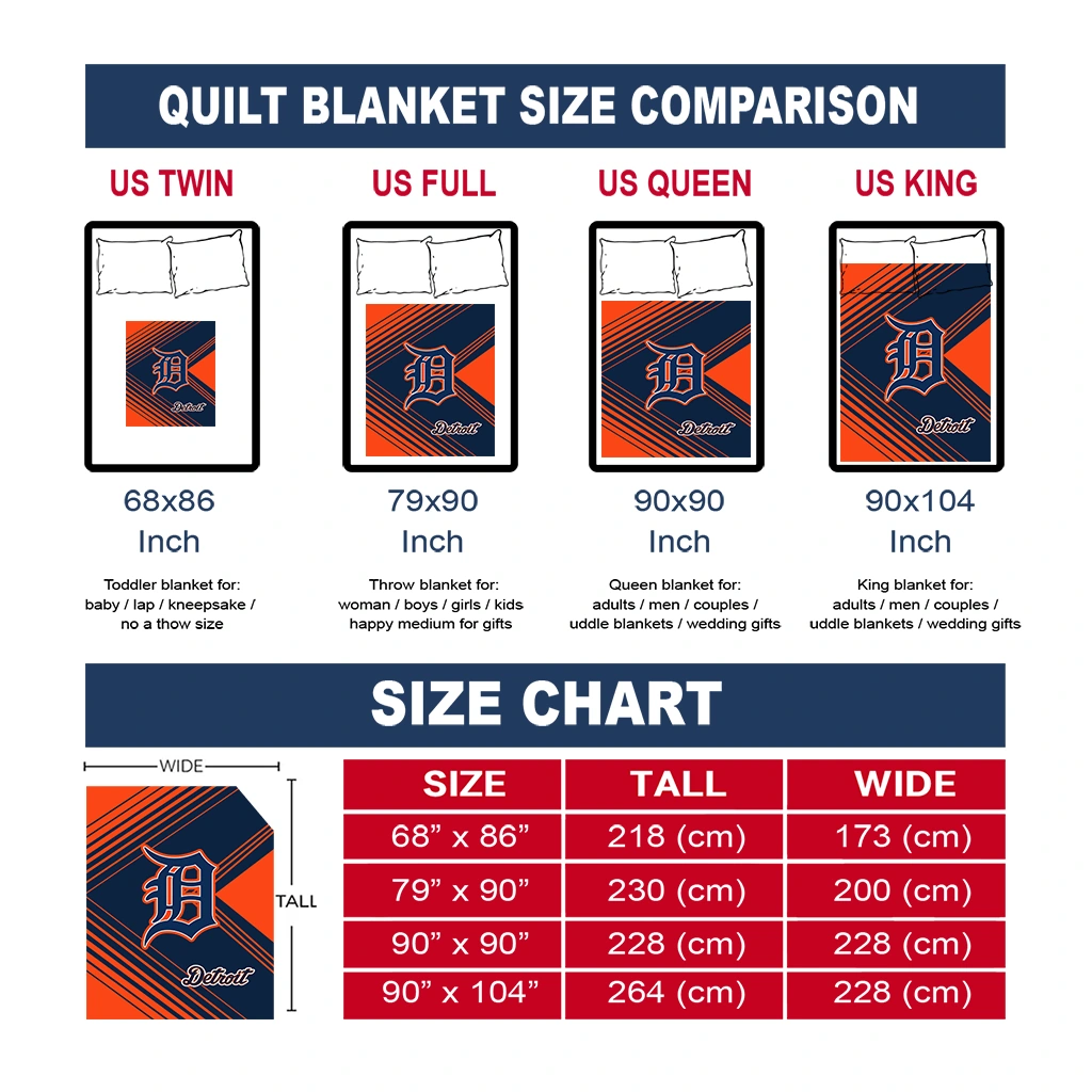 Wrap yourself in warmth and pride with the Detroit Tigers Arrow Layers Navy Quilt Blanket from the Detroit Tigers Blankets collection at Yes That Blanket. Made from 100% premium quilting-weight polyester blended with a touch of microfiber, this quilt offers a smooth, soft finish you’ll love. Choose between two quilting styles—Stipple or Diagonal—and enjoy the comfort of a cotton-filled layer inside that adds extra coziness for every season. The border is available in classic black or white, giving your design a clean, timeless edge.