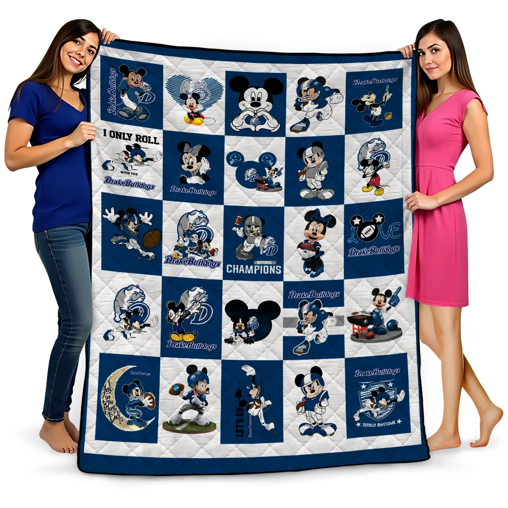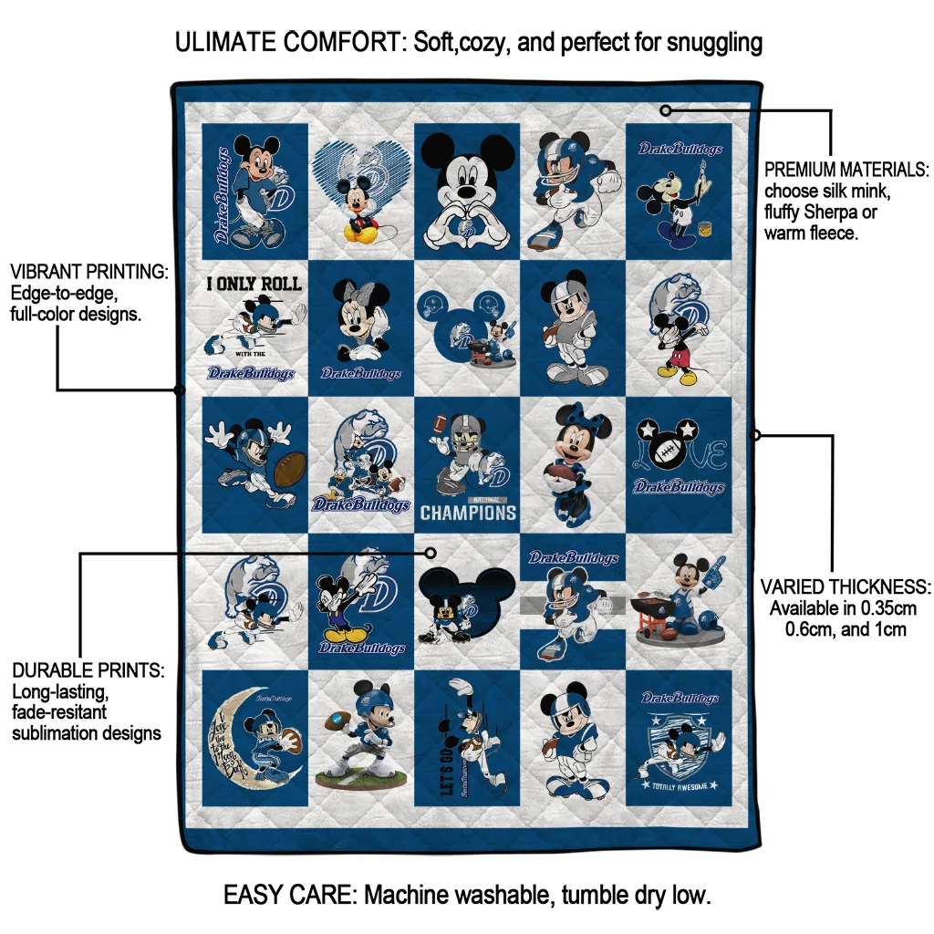 Wrap yourself in warmth and pride with the Drake Bulldogs Mickey Mouse Motif Blue White Quilt Blanket from the Drake Bulldogs Blankets collection at Yes That Blanket. Made from 100% premium quilting-weight polyester blended with a touch of microfiber, this quilt offers a smooth, soft finish you’ll love. Choose between two quilting styles—Stipple or Diagonal—and enjoy the comfort of a cotton-filled layer inside that adds extra coziness for every season. The border is available in classic black or white, giving your design a clean, timeless edge.