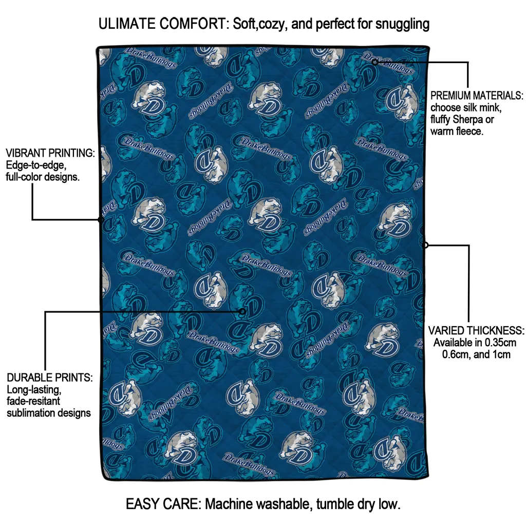 Wrap yourself in warmth and pride with the Drake Bulldogs Solid Classic Blue Quilt Blanket from the Drake Bulldogs Blankets collection at Yes That Blanket. Made from 100% premium quilting-weight polyester blended with a touch of microfiber, this quilt offers a smooth, soft finish you’ll love. Choose between two quilting styles—Stipple or Diagonal—and enjoy the comfort of a cotton-filled layer inside that adds extra coziness for every season. The border is available in classic black or white, giving your design a clean, timeless edge.