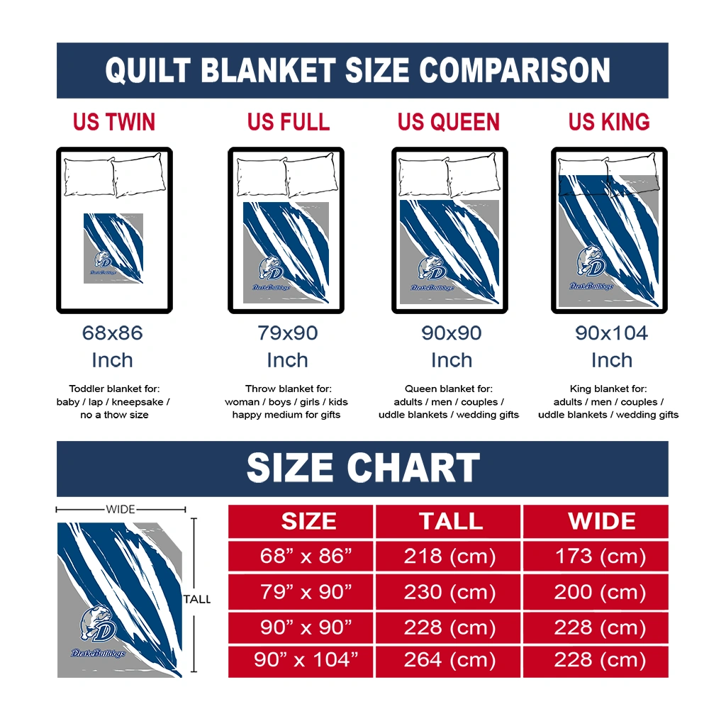 Wrap yourself in warmth and pride with the Drake Bulldogs Stroke Art Blue White Quilt Blanket from the Drake Bulldogs Blankets collection at Yes That Blanket. Made from 100% premium quilting-weight polyester blended with a touch of microfiber, this quilt offers a smooth, soft finish you’ll love. Choose between two quilting styles—Stipple or Diagonal—and enjoy the comfort of a cotton-filled layer inside that adds extra coziness for every season. The border is available in classic black or white, giving your design a clean, timeless edge.