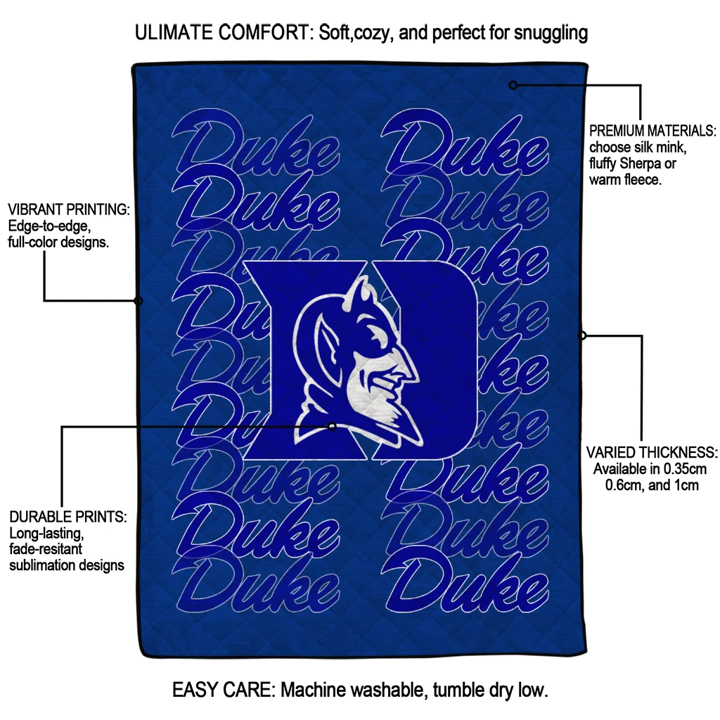 Wrap yourself in warmth and pride with the Duke Blue Devils Bold Red Blue Quilt Blanket from the Duke Blue Devils Blankets collection at Yes That Blanket. Made from 100% premium quilting-weight polyester blended with a touch of microfiber, this quilt offers a smooth, soft finish you’ll love. Choose between two quilting styles—Stipple or Diagonal—and enjoy the comfort of a cotton-filled layer inside that adds extra coziness for every season. The border is available in classic black or white, giving your design a clean, timeless edge.