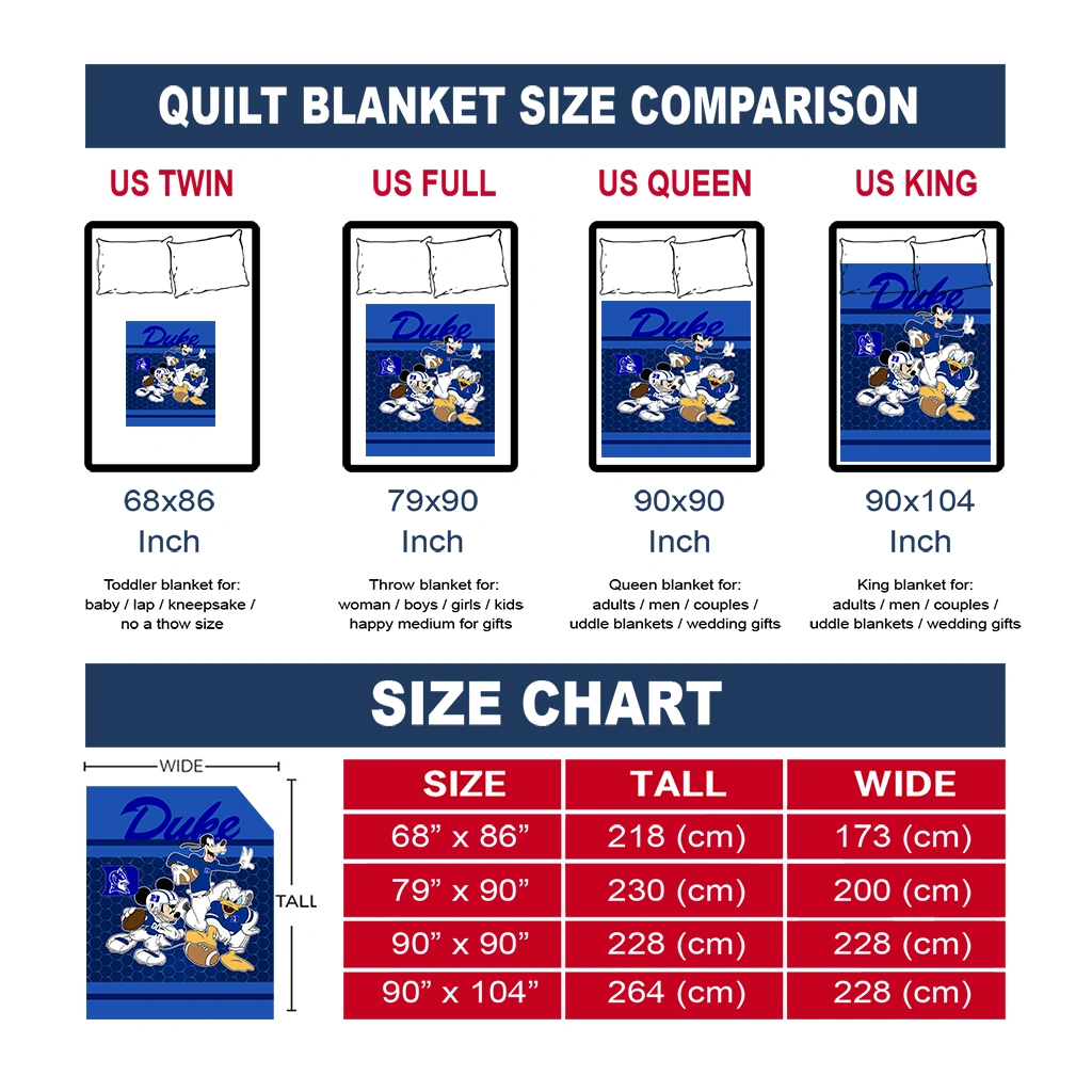 Wrap yourself in warmth and pride with the Duke Blue Devils Disney Football Blue Quilt Blanket from the Duke Blue Devils Blankets collection at Yes That Blanket. Made from 100% premium quilting-weight polyester blended with a touch of microfiber, this quilt offers a smooth, soft finish you’ll love. Choose between two quilting styles—Stipple or Diagonal—and enjoy the comfort of a cotton-filled layer inside that adds extra coziness for every season. The border is available in classic black or white, giving your design a clean, timeless edge.