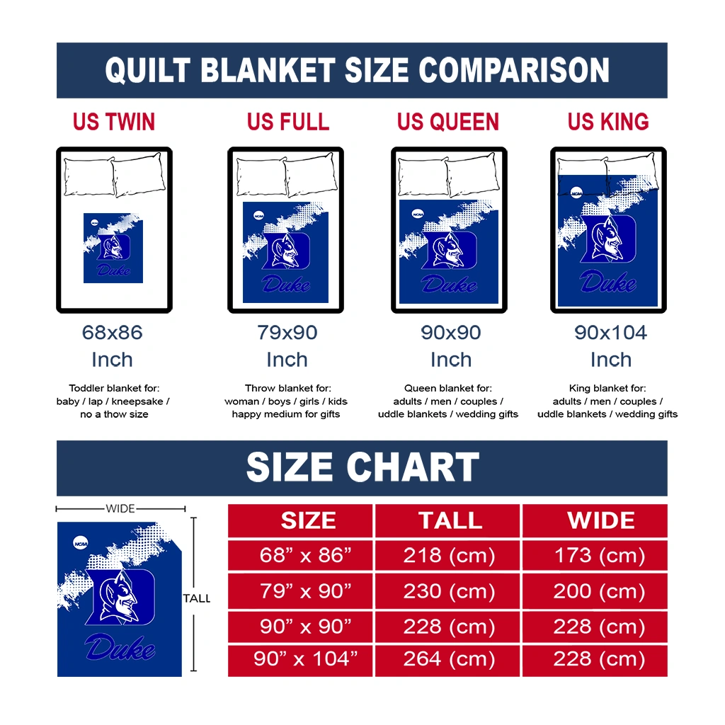 Wrap yourself in warmth and pride with the Duke Blue Devils Paint Trail Blue Quilt Blanket from the Duke Blue Devils Blankets collection at Yes That Blanket. Made from 100% premium quilting-weight polyester blended with a touch of microfiber, this quilt offers a smooth, soft finish you’ll love. Choose between two quilting styles—Stipple or Diagonal—and enjoy the comfort of a cotton-filled layer inside that adds extra coziness for every season. The border is available in classic black or white, giving your design a clean, timeless edge.