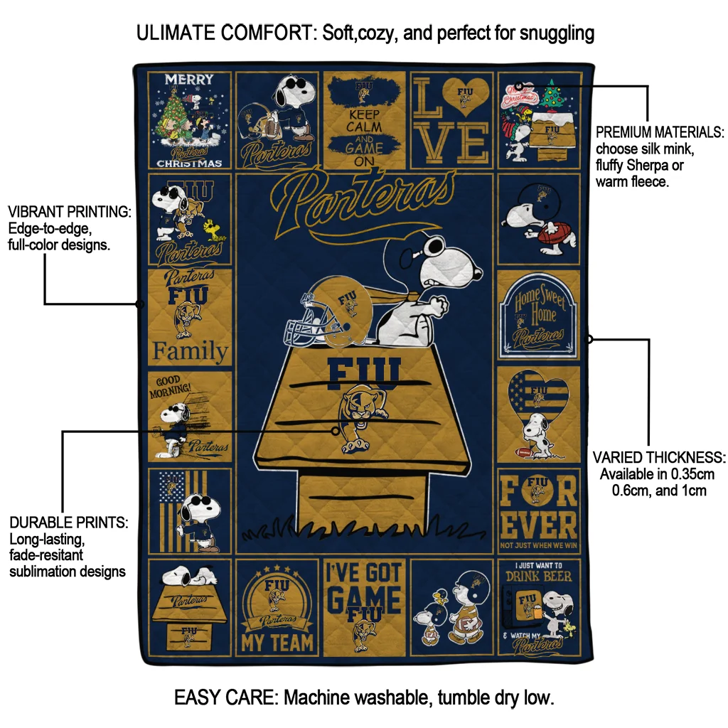 Wrap yourself in warmth and pride with the FIU Panthers Snoopy Love Blue Quilt Blanket from the FIU Panthers Blankets collection at Yes That Blanket. Made from 100% premium quilting-weight polyester blended with a touch of microfiber, this quilt offers a smooth, soft finish you’ll love. Choose between two quilting styles—Stipple or Diagonal—and enjoy the comfort of a cotton-filled layer inside that adds extra coziness for every season. The border is available in classic black or white, giving your design a clean, timeless edge.