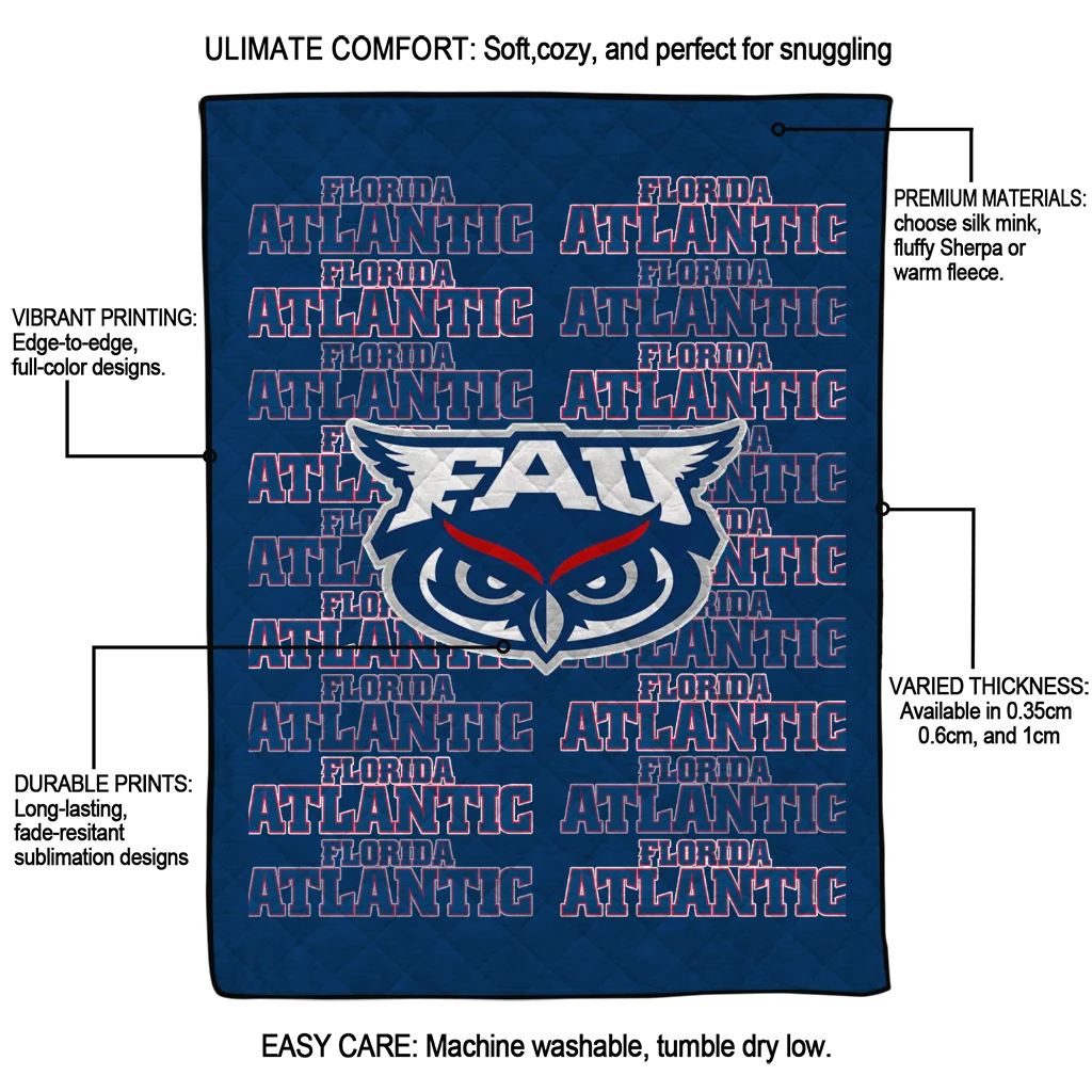 Wrap yourself in warmth and pride with the Florida Atlantic Owls Bold Red Blue Quilt Blanket from the Florida Atlantic Owls Blankets collection at Yes That Blanket. Made from 100% premium quilting-weight polyester blended with a touch of microfiber, this quilt offers a smooth, soft finish you’ll love. Choose between two quilting styles—Stipple or Diagonal—and enjoy the comfort of a cotton-filled layer inside that adds extra coziness for every season. The border is available in classic black or white, giving your design a clean, timeless edge.