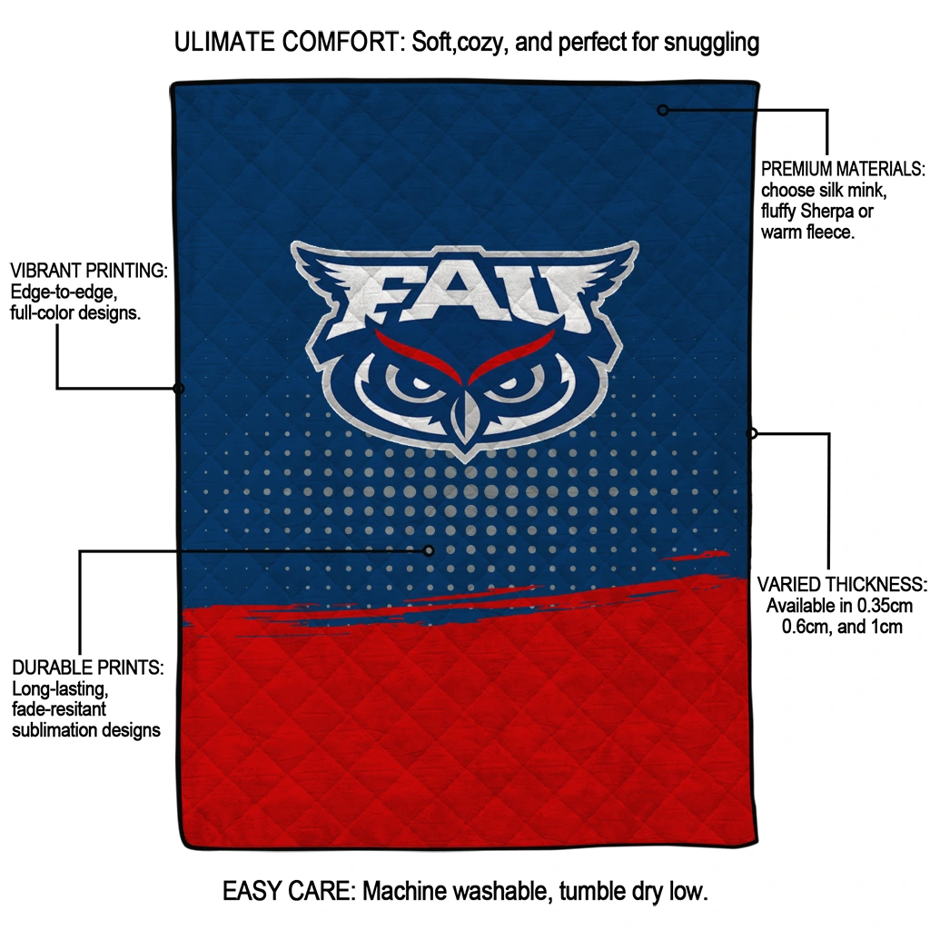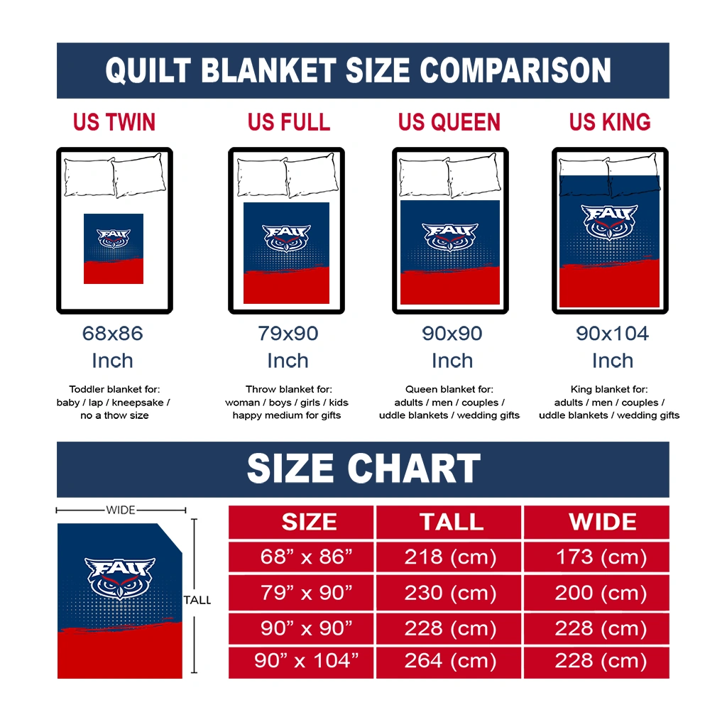 Wrap yourself in warmth and pride with the Florida Atlantic Owls Dot Illusion Blue Quilt Blanket from the Florida Atlantic Owls Blankets collection at Yes That Blanket. Made from 100% premium quilting-weight polyester blended with a touch of microfiber, this quilt offers a smooth, soft finish you’ll love. Choose between two quilting styles—Stipple or Diagonal—and enjoy the comfort of a cotton-filled layer inside that adds extra coziness for every season. The border is available in classic black or white, giving your design a clean, timeless edge.