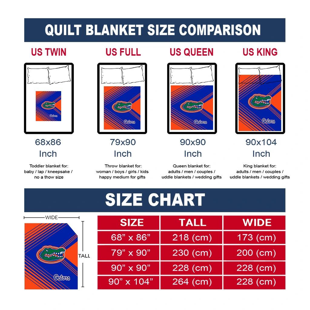 Wrap yourself in warmth and pride with the Florida Gators Arrow Layers Blue Quilt Blanket from the Florida Gators Blankets collection at Yes That Blanket. Made from 100% premium quilting-weight polyester blended with a touch of microfiber, this quilt offers a smooth, soft finish you’ll love. Choose between two quilting styles—Stipple or Diagonal—and enjoy the comfort of a cotton-filled layer inside that adds extra coziness for every season. The border is available in classic black or white, giving your design a clean, timeless edge.