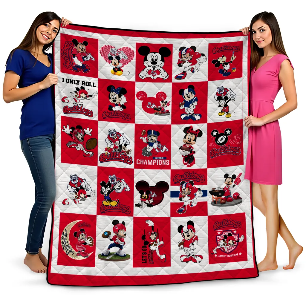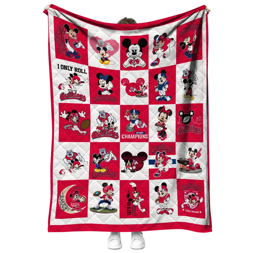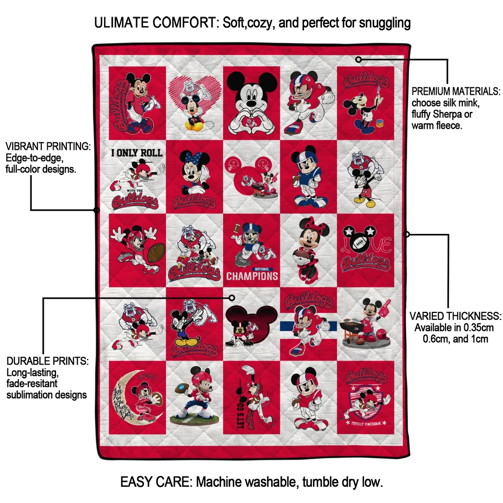 Wrap yourself in warmth and pride with the Fresno State Bulldogs Mickey Mouse Motif Red White Quilt Blanket from the Fresno State Bulldogs Blankets collection at Yes That Blanket. Made from 100% premium quilting-weight polyester blended with a touch of microfiber, this quilt offers a smooth, soft finish you’ll love. Choose between two quilting styles—Stipple or Diagonal—and enjoy the comfort of a cotton-filled layer inside that adds extra coziness for every season. The border is available in classic black or white, giving your design a clean, timeless edge.