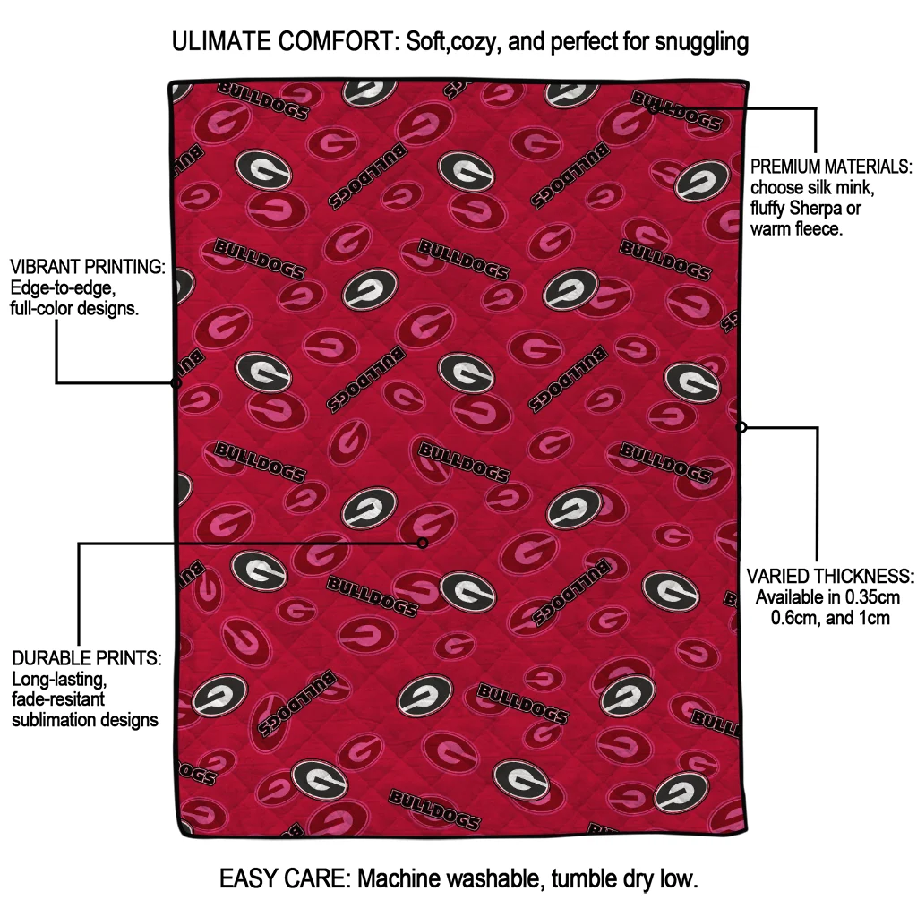 Wrap yourself in warmth and pride with the Georgia Bulldogs Solid Classic Red Quilt Blanket from the Georgia Bulldogs Blankets collection at Yes That Blanket. Made from 100% premium quilting-weight polyester blended with a touch of microfiber, this quilt offers a smooth, soft finish you’ll love. Choose between two quilting styles—Stipple or Diagonal—and enjoy the comfort of a cotton-filled layer inside that adds extra coziness for every season. The border is available in classic black or white, giving your design a clean, timeless edge.