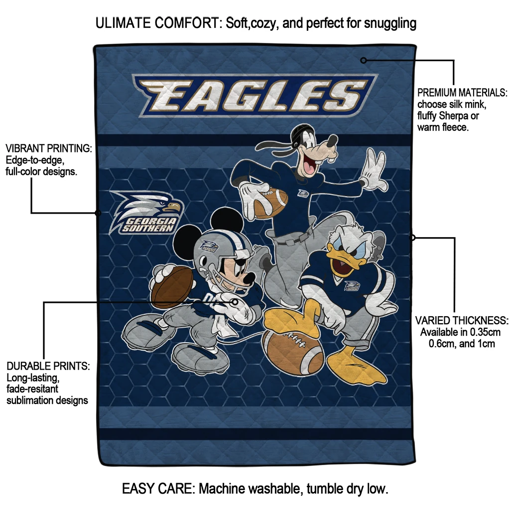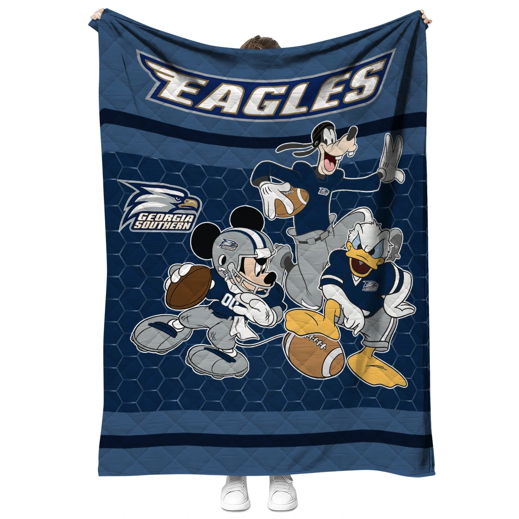 Wrap yourself in warmth and pride with the Georgia Southern Eagles Disney Football Blue Quilt Blanket from the Georgia Southern Eagles Blankets collection at Yes That Blanket. Made from 100% premium quilting-weight polyester blended with a touch of microfiber, this quilt offers a smooth, soft finish you’ll love. Choose between two quilting styles—Stipple or Diagonal—and enjoy the comfort of a cotton-filled layer inside that adds extra coziness for every season. The border is available in classic black or white, giving your design a clean, timeless edge.