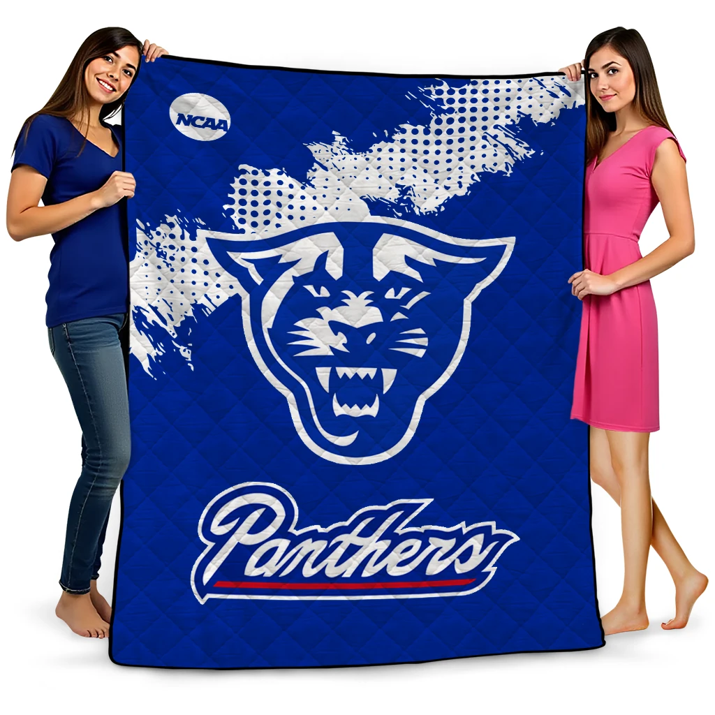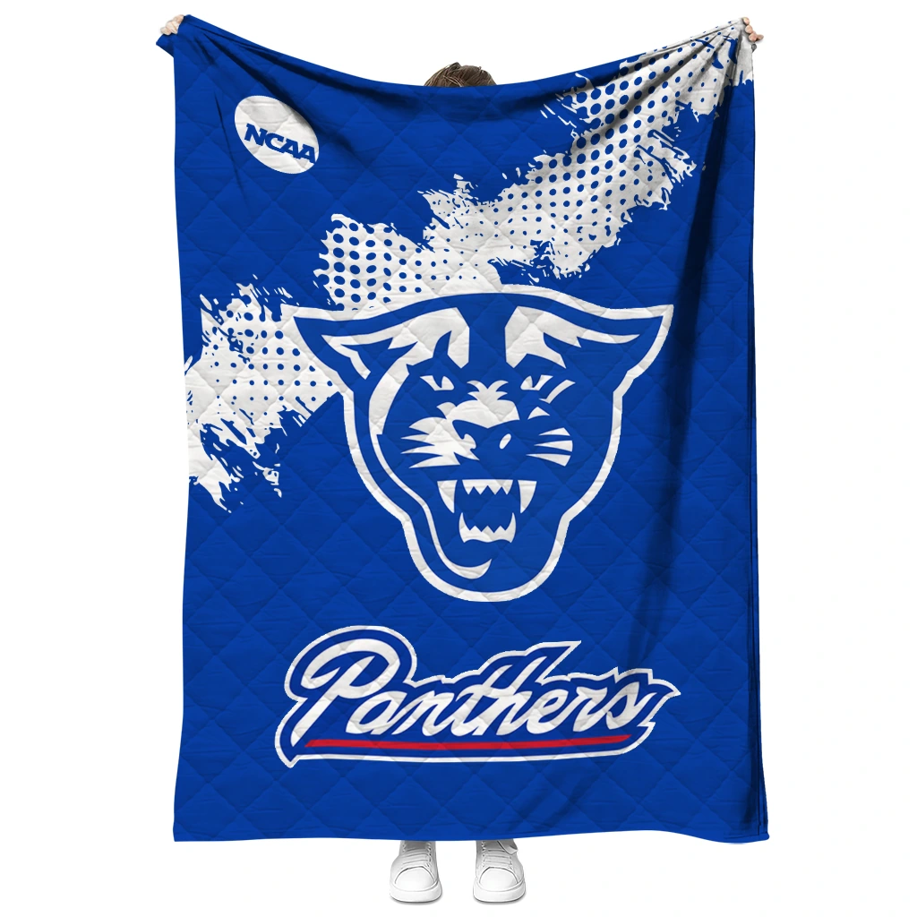 Wrap yourself in warmth and pride with the Georgia State Panthers Paint Trail Blue Quilt Blanket from the Georgia State Panthers Blankets collection at Yes That Blanket. Made from 100% premium quilting-weight polyester blended with a touch of microfiber, this quilt offers a smooth, soft finish you’ll love. Choose between two quilting styles—Stipple or Diagonal—and enjoy the comfort of a cotton-filled layer inside that adds extra coziness for every season. The border is available in classic black or white, giving your design a clean, timeless edge.