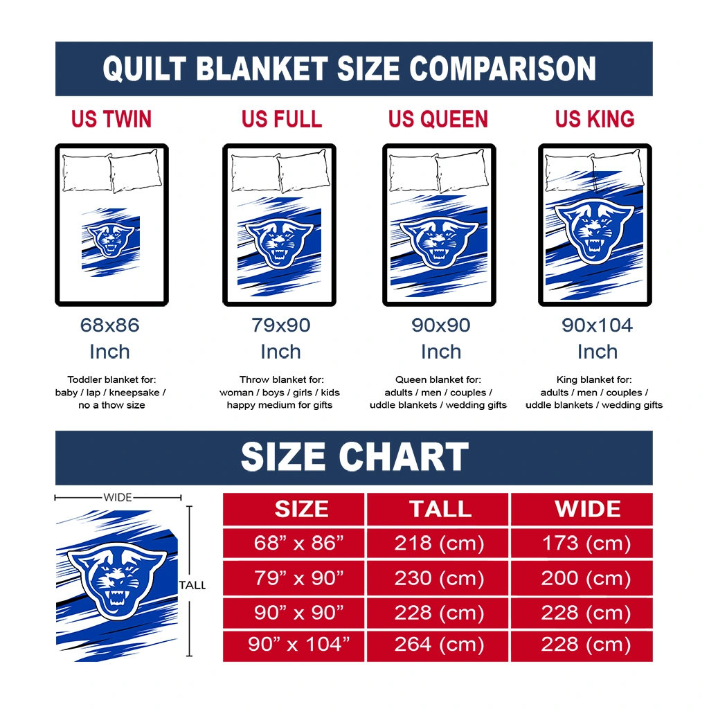 Wrap yourself in warmth and pride with the Georgia State Panthers Wild Lines Blue White Quilt Blanket from the Georgia State Panthers Blankets collection at Yes That Blanket. Made from 100% premium quilting-weight polyester blended with a touch of microfiber, this quilt offers a smooth, soft finish you’ll love. Choose between two quilting styles—Stipple or Diagonal—and enjoy the comfort of a cotton-filled layer inside that adds extra coziness for every season. The border is available in classic black or white, giving your design a clean, timeless edge.