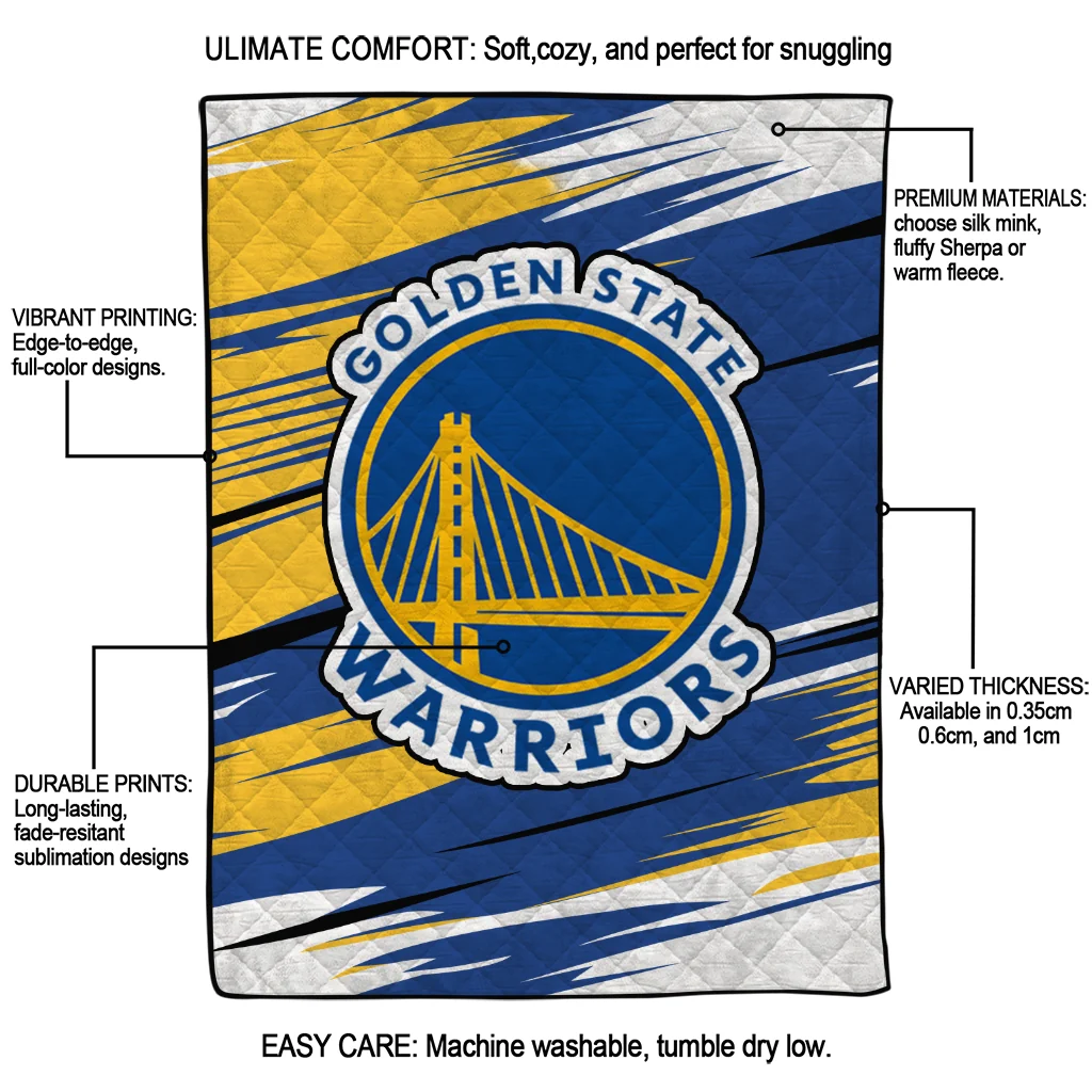 Wrap yourself in warmth and pride with the Golden State Warriors Wild Lines Blue White Quilt Blanket from the Golden State Warriors Blankets collection at Yes That Blanket. Made from 100% premium quilting-weight polyester blended with a touch of microfiber, this quilt offers a smooth, soft finish you’ll love. Choose between two quilting styles—Stipple or Diagonal—and enjoy the comfort of a cotton-filled layer inside that adds extra coziness for every season. The border is available in classic black or white, giving your design a clean, timeless edge.