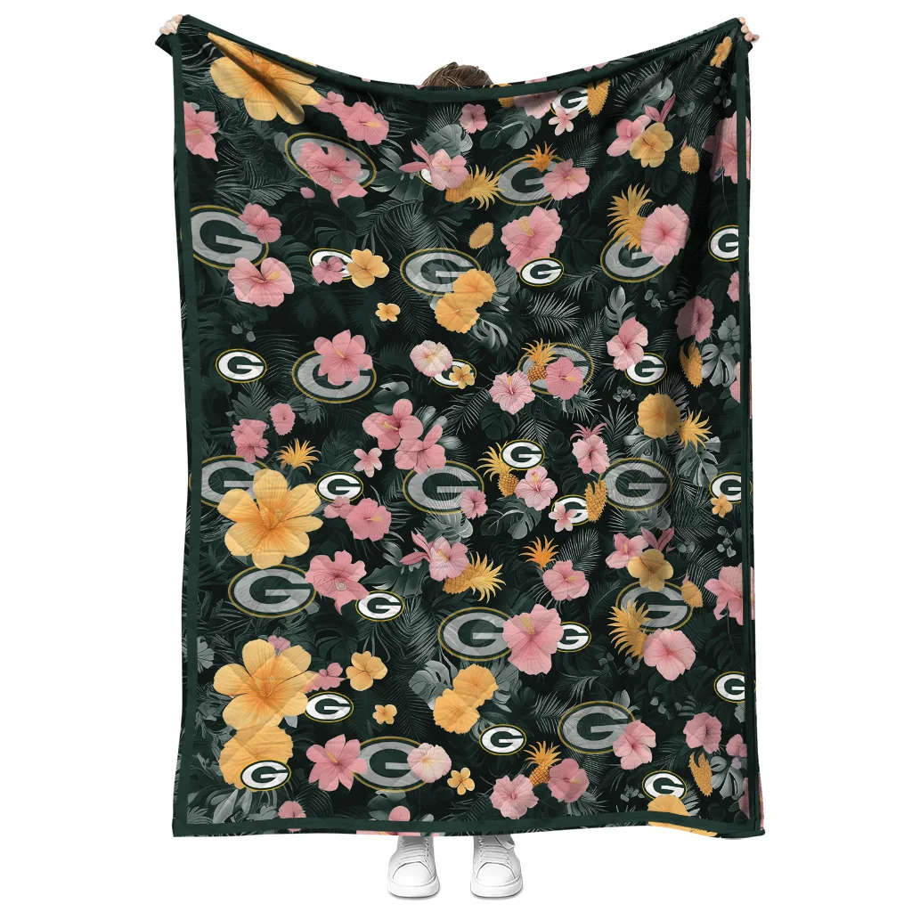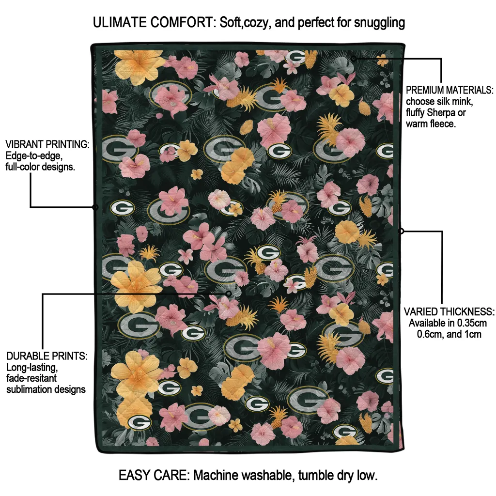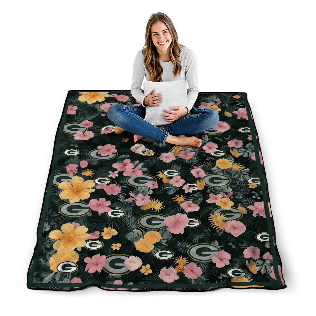 Wrap yourself in warmth and pride with the Green Bay Packers Hibiscus Foliage Green Quilt Blanket from the Green Bay Packers Blankets collection at Yes That Blanket. Made from 100% premium quilting-weight polyester blended with a touch of microfiber, this quilt offers a smooth, soft finish you’ll love. Choose between two quilting styles—Stipple or Diagonal—and enjoy the comfort of a cotton-filled layer inside that adds extra coziness for every season. The border is available in classic black or white, giving your design a clean, timeless edge.