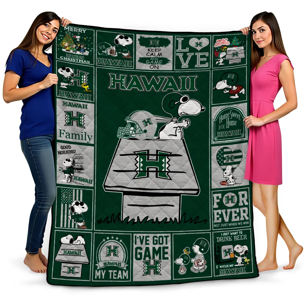 Wrap yourself in warmth and pride with the Hawaii Rainbow Warriors Snoopy Love Green Quilt Blanket from the Hawaii Rainbow Warriors Blankets collection at Yes That Blanket. Made from 100% premium quilting-weight polyester blended with a touch of microfiber, this quilt offers a smooth, soft finish you’ll love. Choose between two quilting styles—Stipple or Diagonal—and enjoy the comfort of a cotton-filled layer inside that adds extra coziness for every season. The border is available in classic black or white, giving your design a clean, timeless edge.