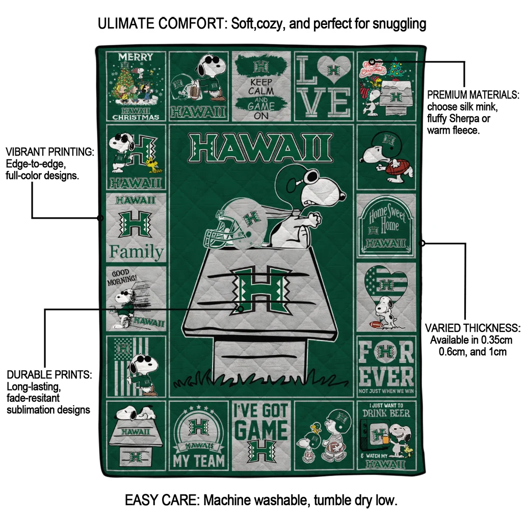 The Hawaii Rainbow Warriors Snoopy Love Green Quilt Blanket is more than a blanket—it’s everyday comfort, thoughtfully made. Crafted from premium quilting fabric with a soft microfiber touch, it offers a smooth hand-feel and lasting coziness. Layered quilting with a cotton-filled core provides adaptable warmth across seasons while maintaining a clean, tailored look on your bed or sofa.