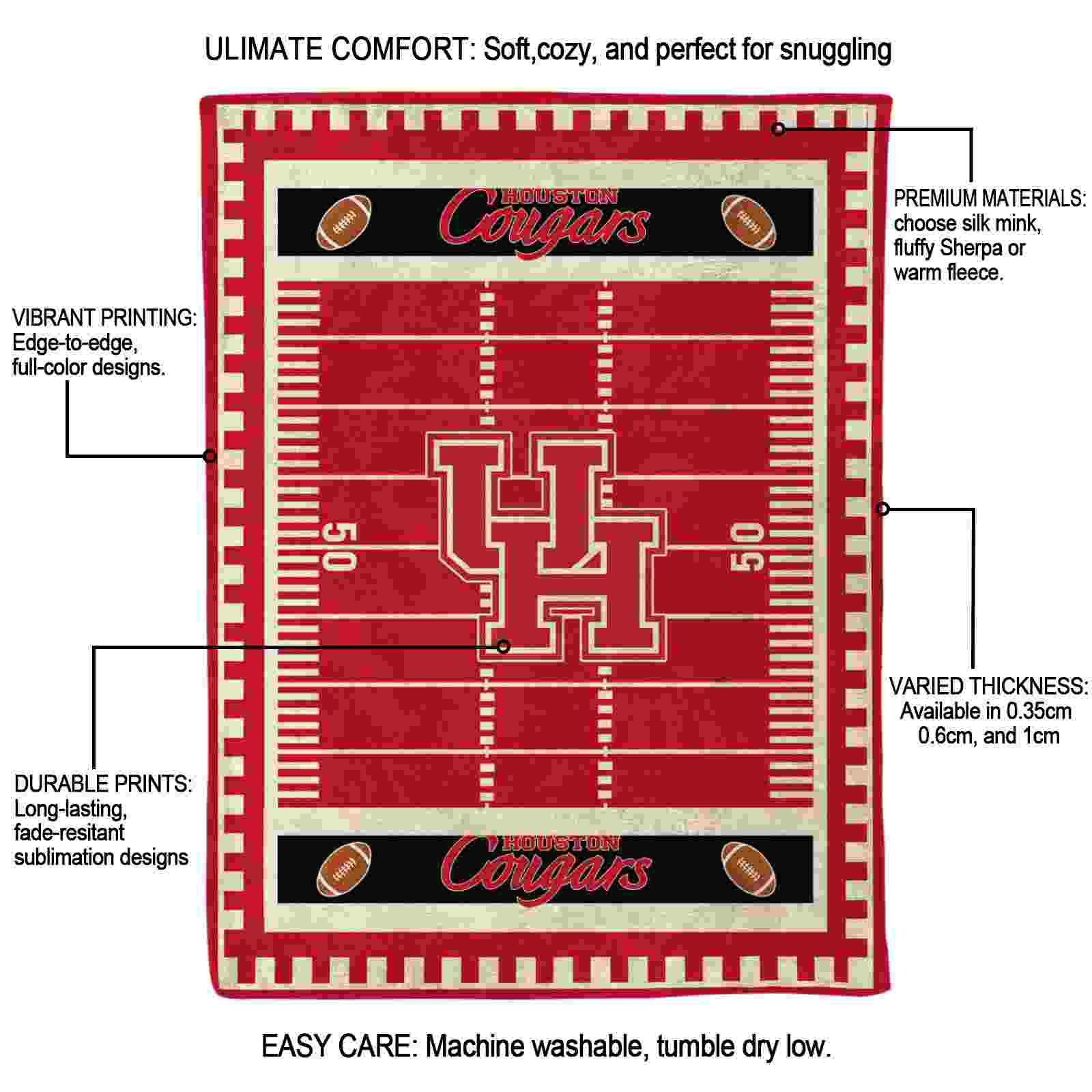 Without a doubt, the Houston Cougars Football Field Red Blanket from Houston Cougars Blankets collection is offering true fans a chance to showcase passion in a cool way. Personalize it with your favorite team’s logo or a meaningful name to make it uniquely yours. Isn’t that great? The full-color print ensures vibrant, edge-to-edge designs, bringing your sports enthusiasm to life!