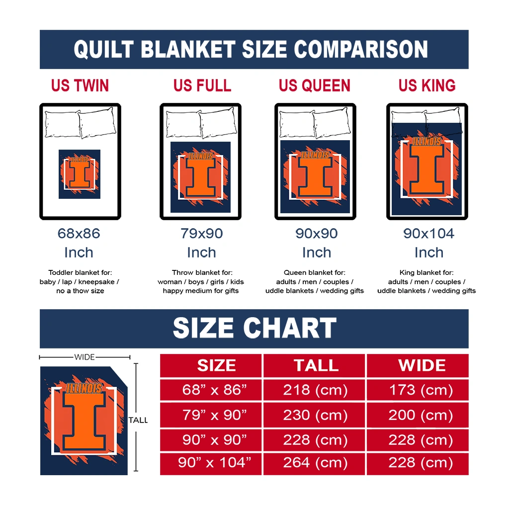 Wrap yourself in warmth and pride with the Illinois Fighting Illini Block Border Blue Quilt Blanket from the Illinois Fighting Illini Blankets collection at Yes That Blanket. Made from 100% premium quilting-weight polyester blended with a touch of microfiber, this quilt offers a smooth, soft finish you’ll love. Choose between two quilting styles—Stipple or Diagonal—and enjoy the comfort of a cotton-filled layer inside that adds extra coziness for every season. The border is available in classic black or white, giving your design a clean, timeless edge.