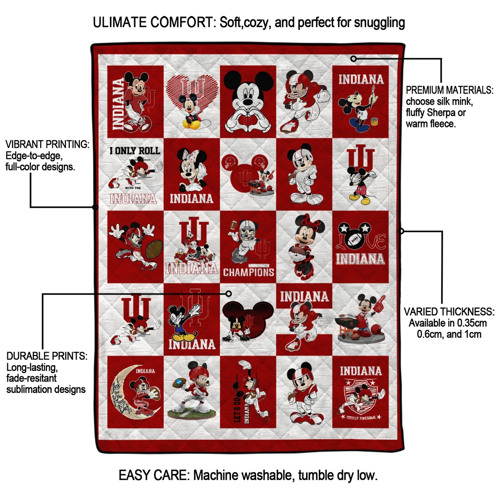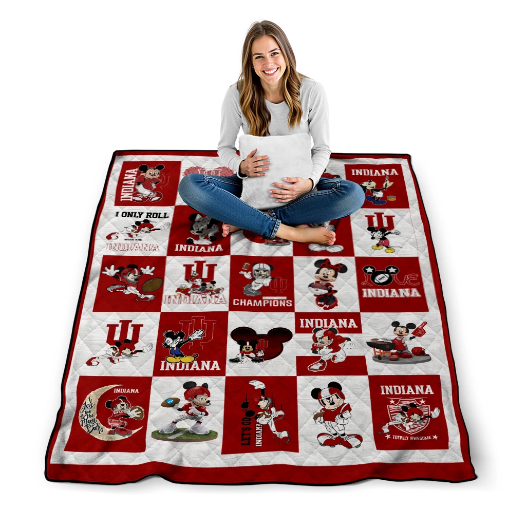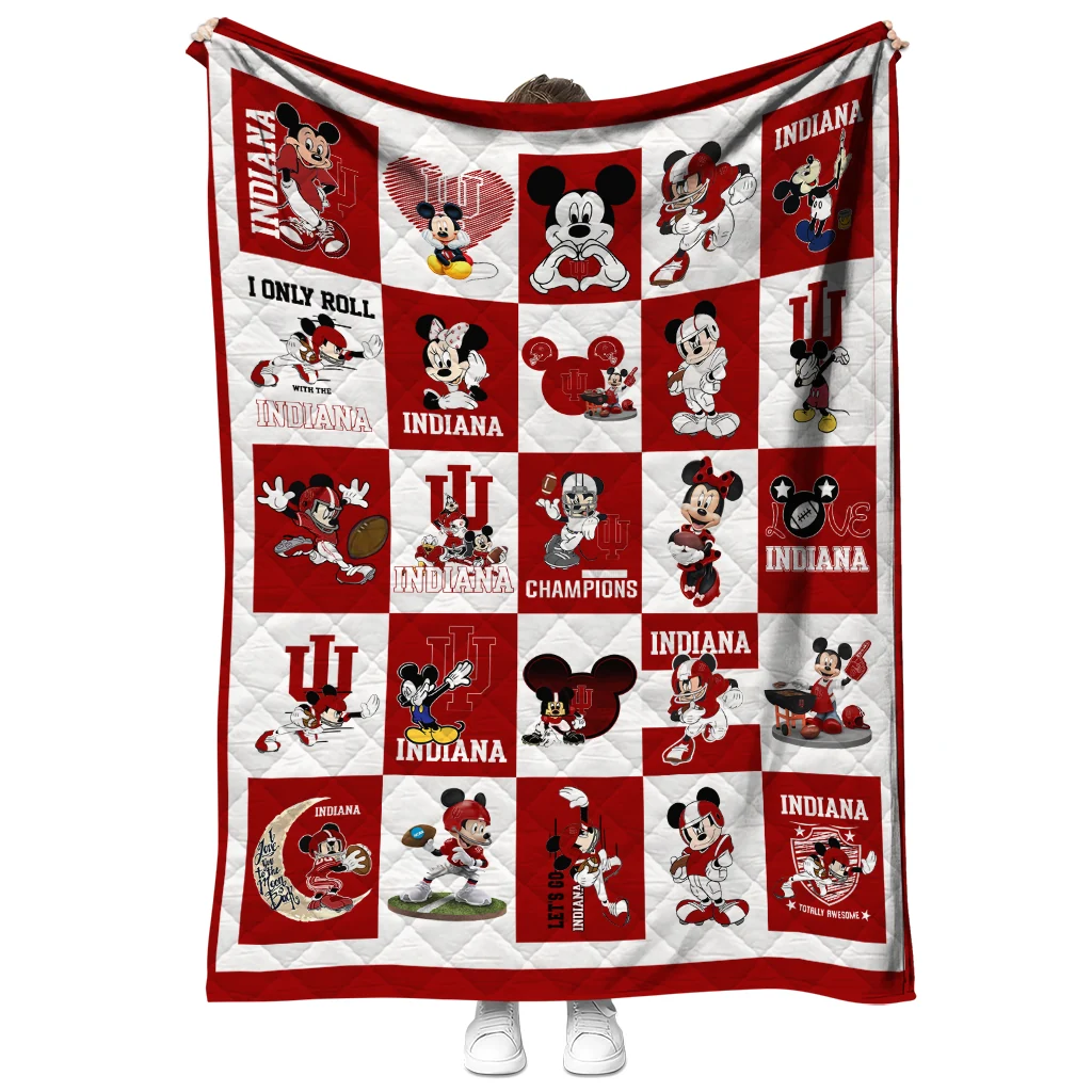 Wrap yourself in warmth and pride with the Indiana Hoosiers Mickey Mouse Motif Red White Quilt Blanket from the Indiana Hoosiers Blankets collection at Yes That Blanket. Made from 100% premium quilting-weight polyester blended with a touch of microfiber, this quilt offers a smooth, soft finish you’ll love. Choose between two quilting styles—Stipple or Diagonal—and enjoy the comfort of a cotton-filled layer inside that adds extra coziness for every season. The border is available in classic black or white, giving your design a clean, timeless edge.