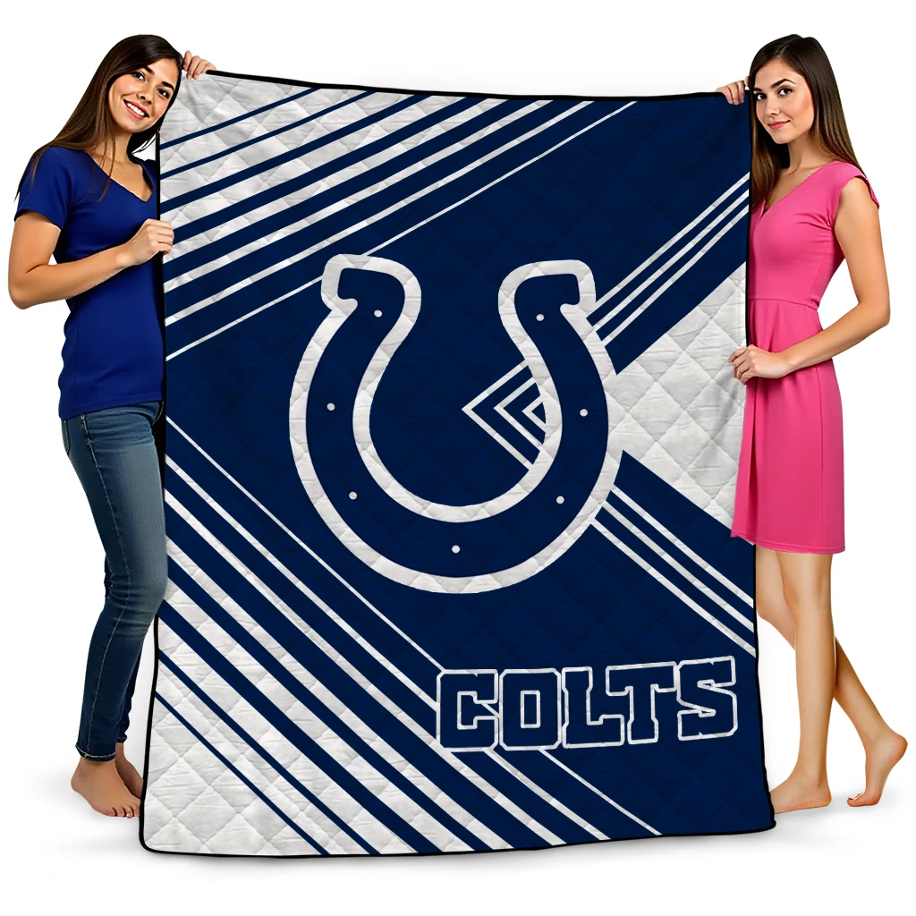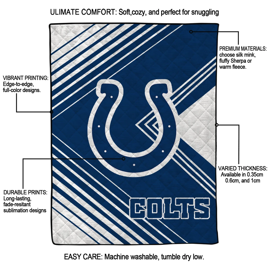 Wrap yourself in warmth and pride with the Indianapolis Colts Arrow Layers Blue Quilt Blanket from the Indianapolis Colts Blankets collection at Yes That Blanket. Made from 100% premium quilting-weight polyester blended with a touch of microfiber, this quilt offers a smooth, soft finish you’ll love. Choose between two quilting styles—Stipple or Diagonal—and enjoy the comfort of a cotton-filled layer inside that adds extra coziness for every season. The border is available in classic black or white, giving your design a clean, timeless edge.