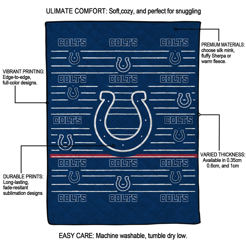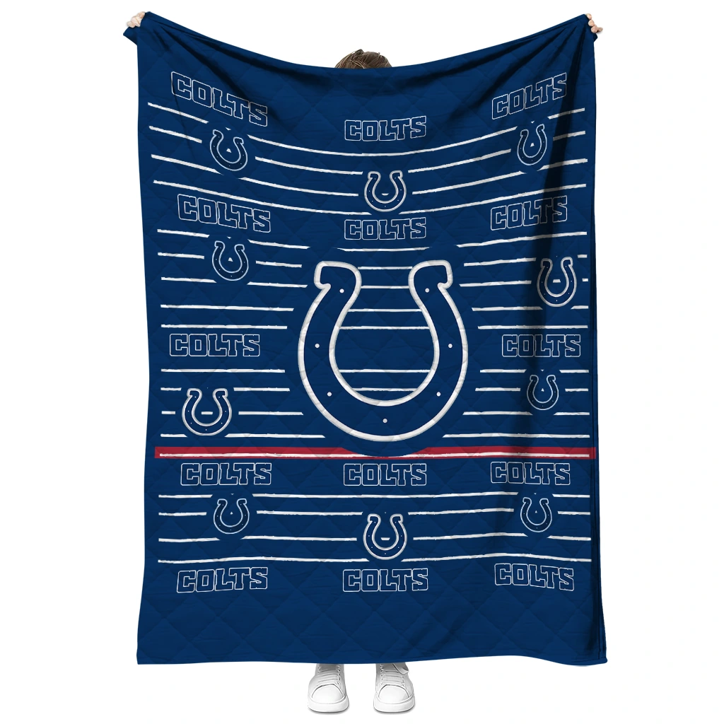 Wrap yourself in warmth and pride with the Indianapolis Colts Handdrawn Stripes Blue Quilt Blanket from the Indianapolis Colts Blankets collection at Yes That Blanket. Made from 100% premium quilting-weight polyester blended with a touch of microfiber, this quilt offers a smooth, soft finish you’ll love. Choose between two quilting styles—Stipple or Diagonal—and enjoy the comfort of a cotton-filled layer inside that adds extra coziness for every season. The border is available in classic black or white, giving your design a clean, timeless edge.