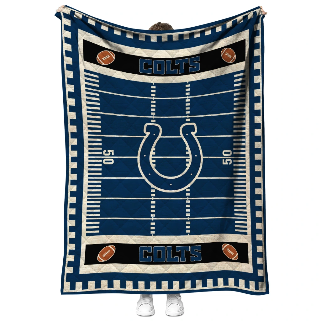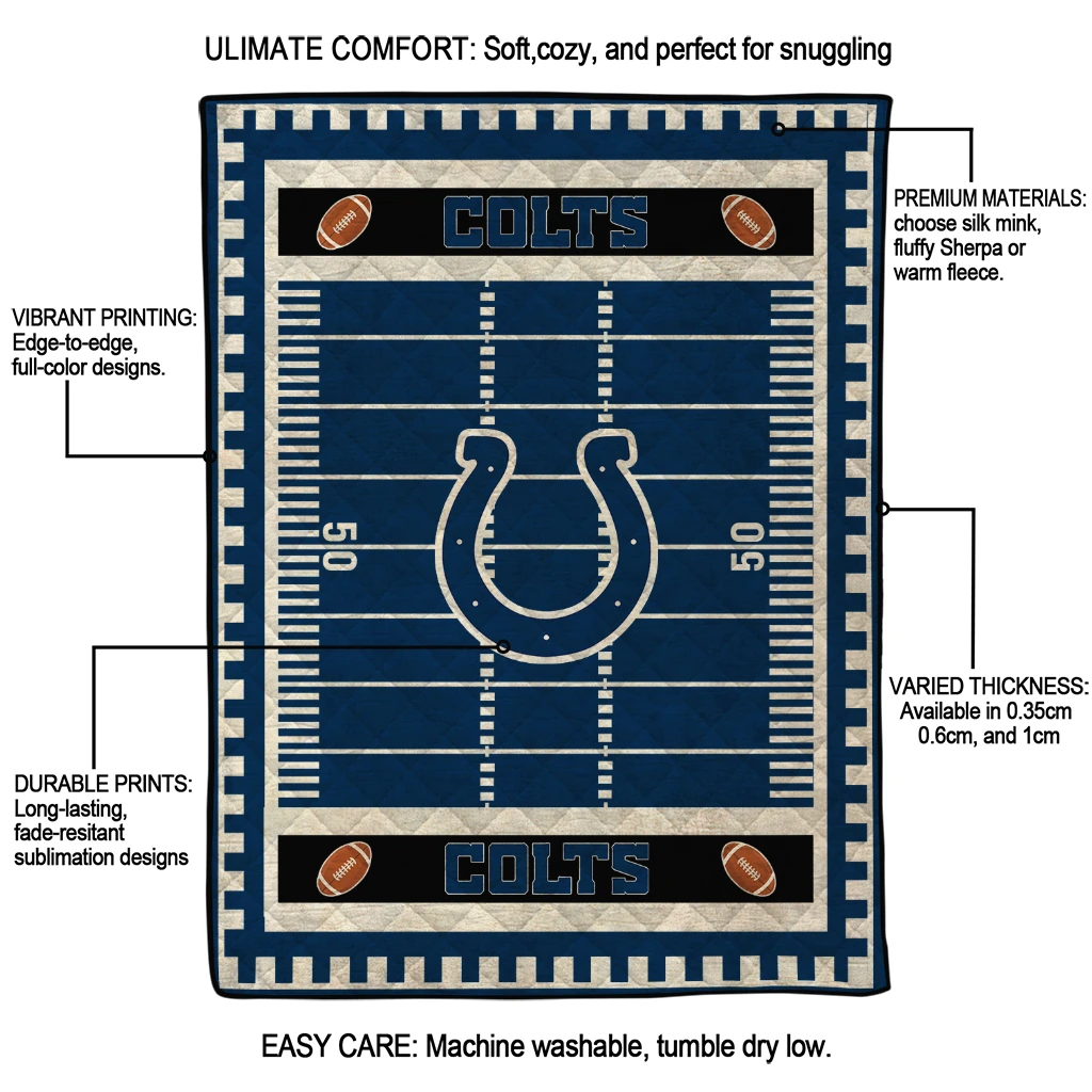 Wrap yourself in warmth and pride with the Indianapolis Colts Mickey Player Blue Quilt Blanket from the Indianapolis Colts Blankets collection at Yes That Blanket. Made from 100% premium quilting-weight polyester blended with a touch of microfiber, this quilt offers a smooth, soft finish you’ll love. Choose between two quilting styles—Stipple or Diagonal—and enjoy the comfort of a cotton-filled layer inside that adds extra coziness for every season. The border is available in classic black or white, giving your design a clean, timeless edge.