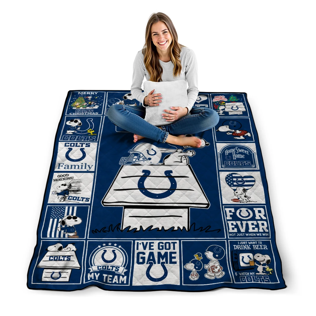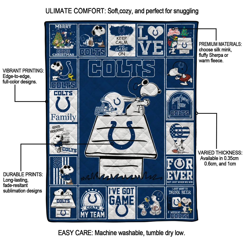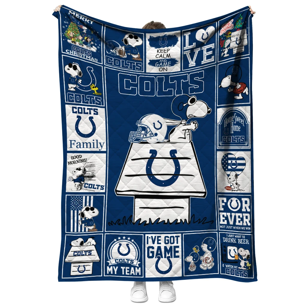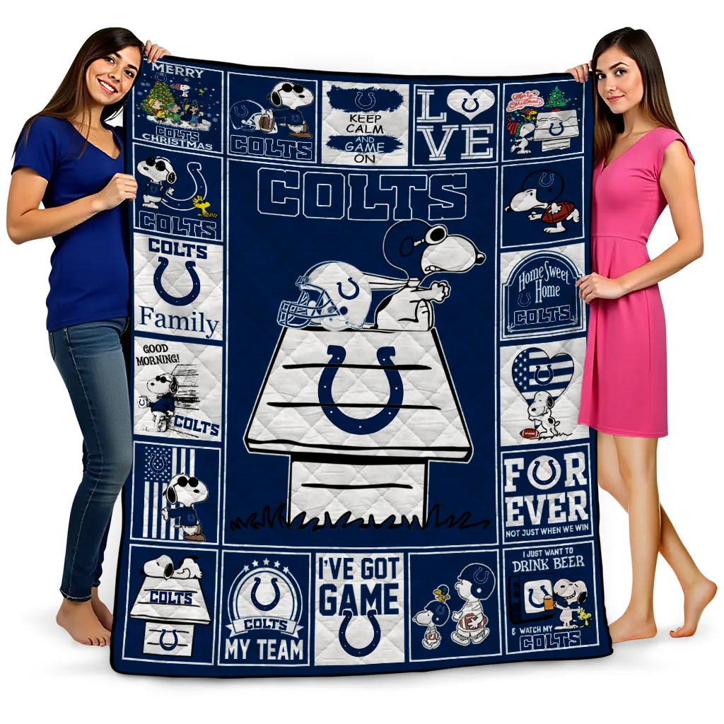 Wrap yourself in warmth and pride with the Indianapolis Colts Snoopy Love Blue Quilt Blanket from the Indianapolis Colts Blankets collection at Yes That Blanket. Made from 100% premium quilting-weight polyester blended with a touch of microfiber, this quilt offers a smooth, soft finish you’ll love. Choose between two quilting styles—Stipple or Diagonal—and enjoy the comfort of a cotton-filled layer inside that adds extra coziness for every season. The border is available in classic black or white, giving your design a clean, timeless edge.
