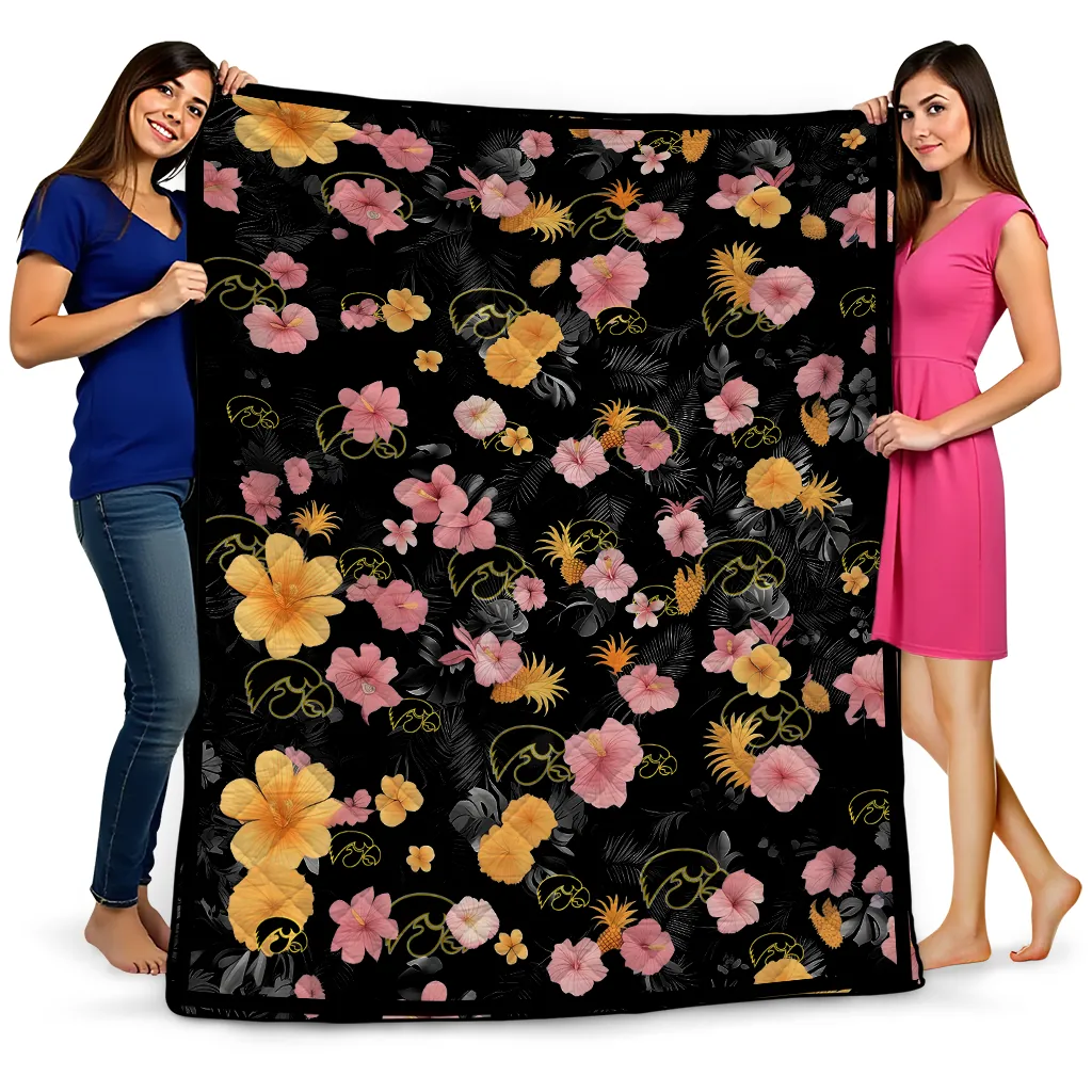 Wrap yourself in warmth and pride with the Iowa Hawkeyes Hibiscus Foliage Black Quilt Blanket from the Iowa Hawkeyes Blankets collection at Yes That Blanket. Made from 100% premium quilting-weight polyester blended with a touch of microfiber, this quilt offers a smooth, soft finish you’ll love. Choose between two quilting styles—Stipple or Diagonal—and enjoy the comfort of a cotton-filled layer inside that adds extra coziness for every season. The border is available in classic black or white, giving your design a clean, timeless edge.