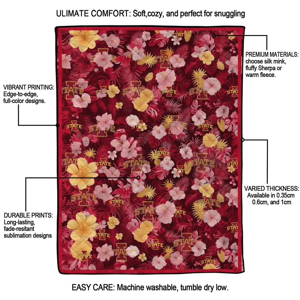 Wrap yourself in warmth and pride with the Iowa State Cyclones Hibiscus Foliage Red Quilt Blanket from the Iowa State Cyclones Blankets collection at Yes That Blanket. Made from 100% premium quilting-weight polyester blended with a touch of microfiber, this quilt offers a smooth, soft finish you’ll love. Choose between two quilting styles—Stipple or Diagonal—and enjoy the comfort of a cotton-filled layer inside that adds extra coziness for every season. The border is available in classic black or white, giving your design a clean, timeless edge.