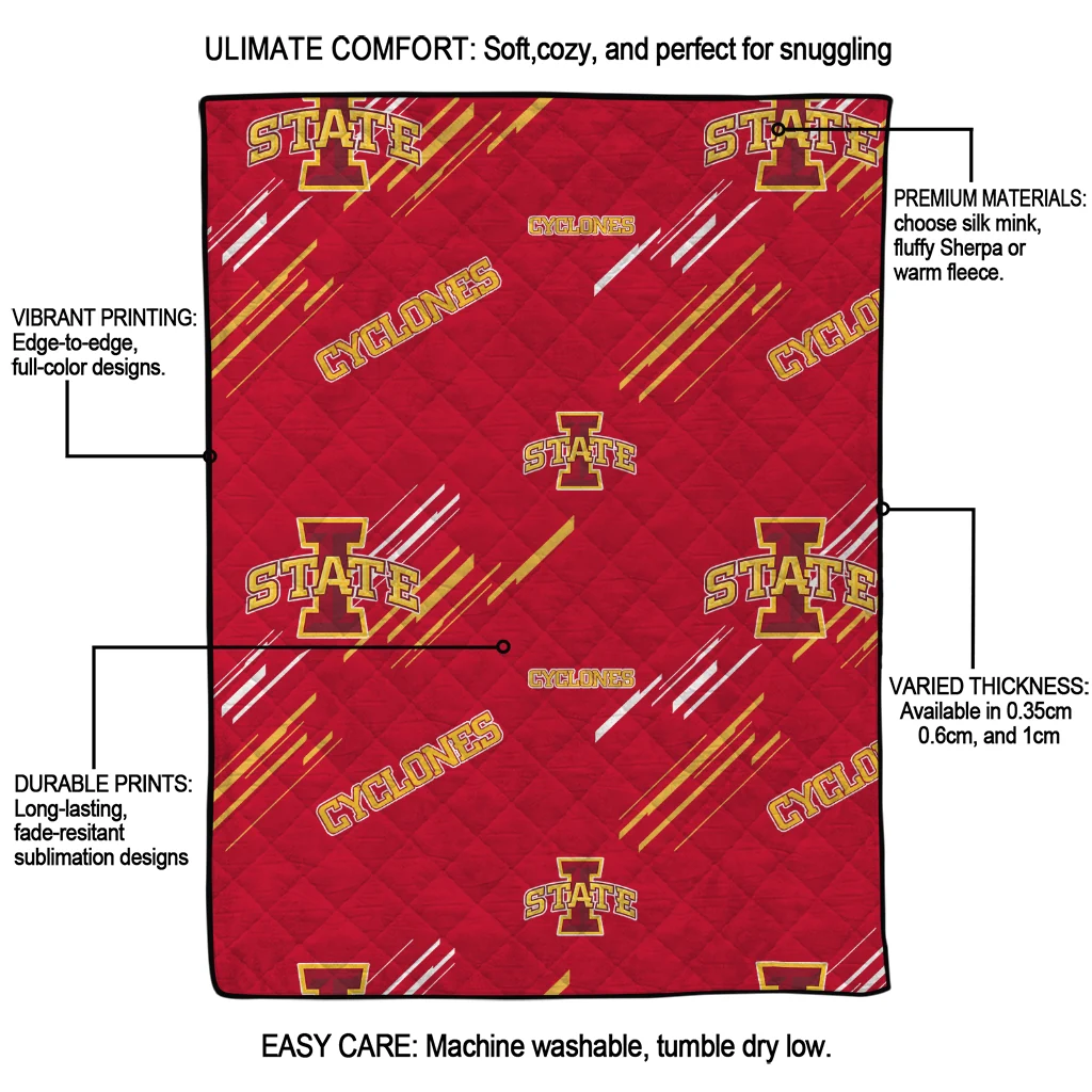Wrap yourself in warmth and pride with the Iowa State Cyclones Sketch Lines Red Quilt Blanket from the Iowa State Cyclones Blankets collection at Yes That Blanket. Made from 100% premium quilting-weight polyester blended with a touch of microfiber, this quilt offers a smooth, soft finish you’ll love. Choose between two quilting styles—Stipple or Diagonal—and enjoy the comfort of a cotton-filled layer inside that adds extra coziness for every season. The border is available in classic black or white, giving your design a clean, timeless edge.