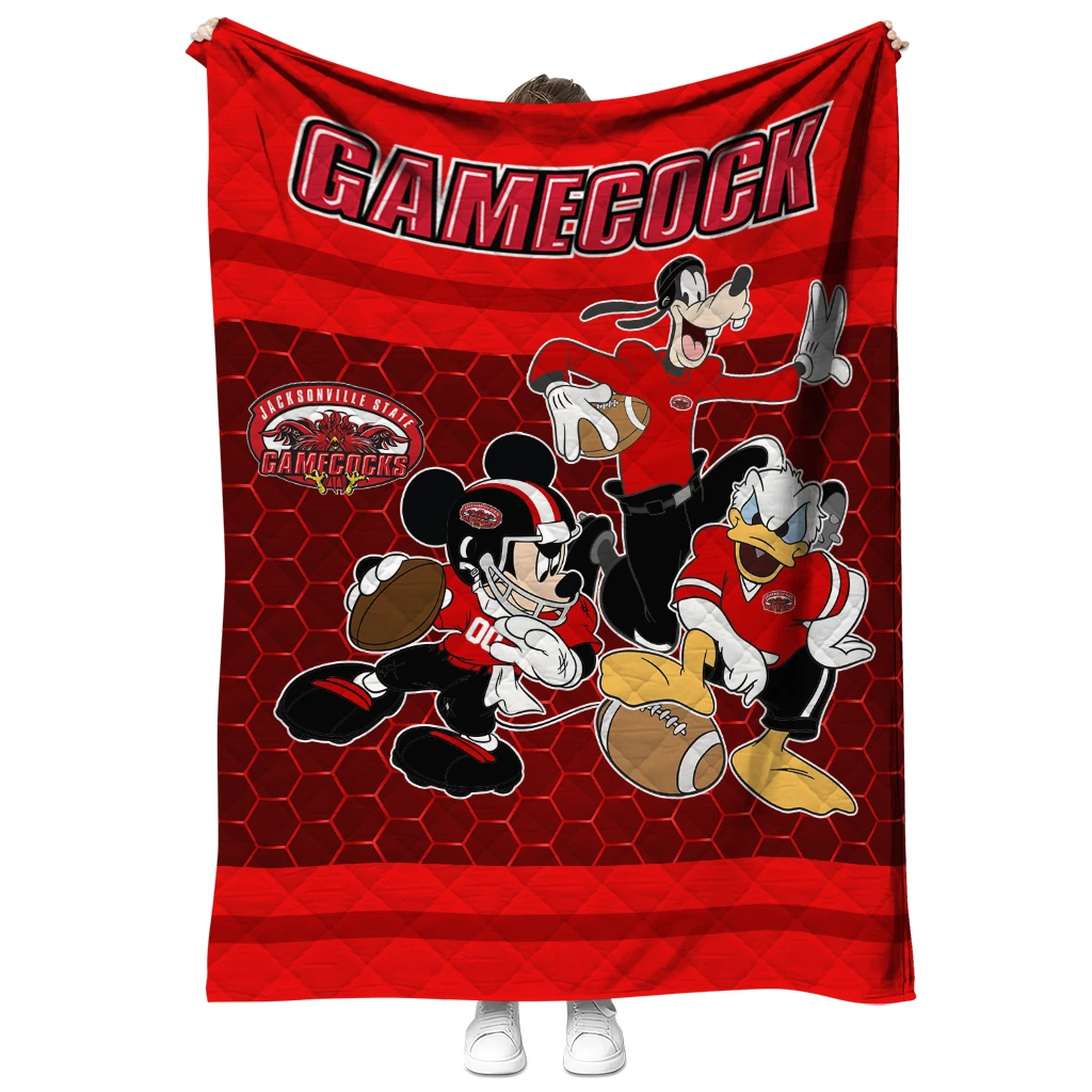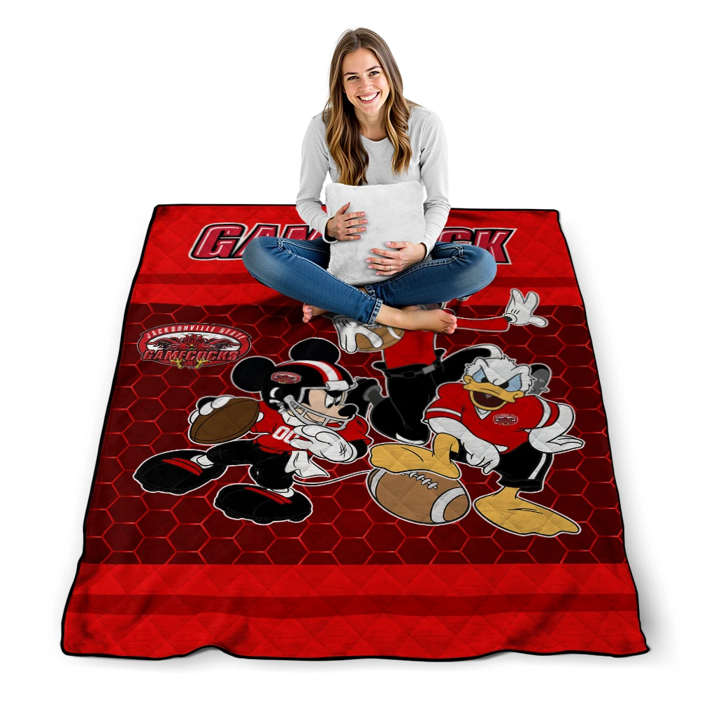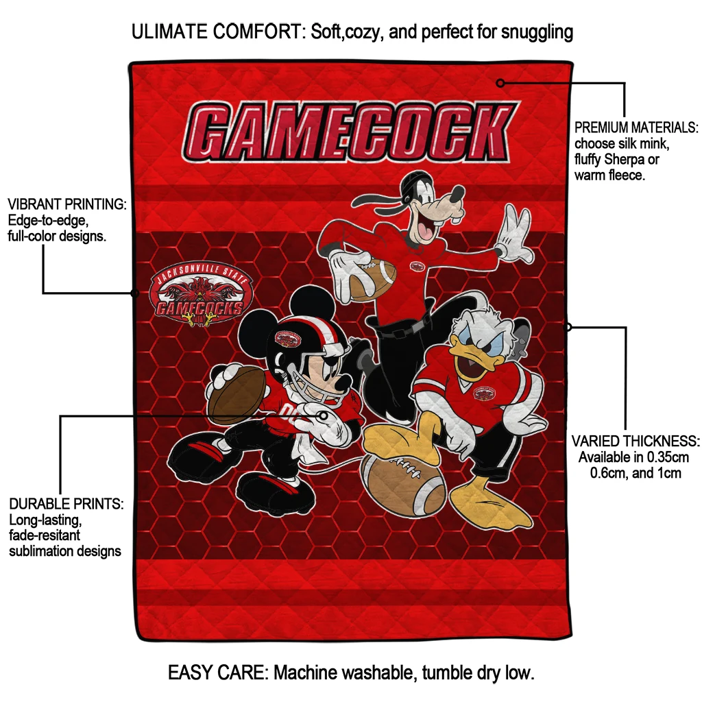 Wrap yourself in warmth and pride with the Jacksonville State Gamecocks Disney Football Red Quilt Blanket from the Jacksonville State Gamecocks Blankets collection at Yes That Blanket. Made from 100% premium quilting-weight polyester blended with a touch of microfiber, this quilt offers a smooth, soft finish you’ll love. Choose between two quilting styles—Stipple or Diagonal—and enjoy the comfort of a cotton-filled layer inside that adds extra coziness for every season. The border is available in classic black or white, giving your design a clean, timeless edge.