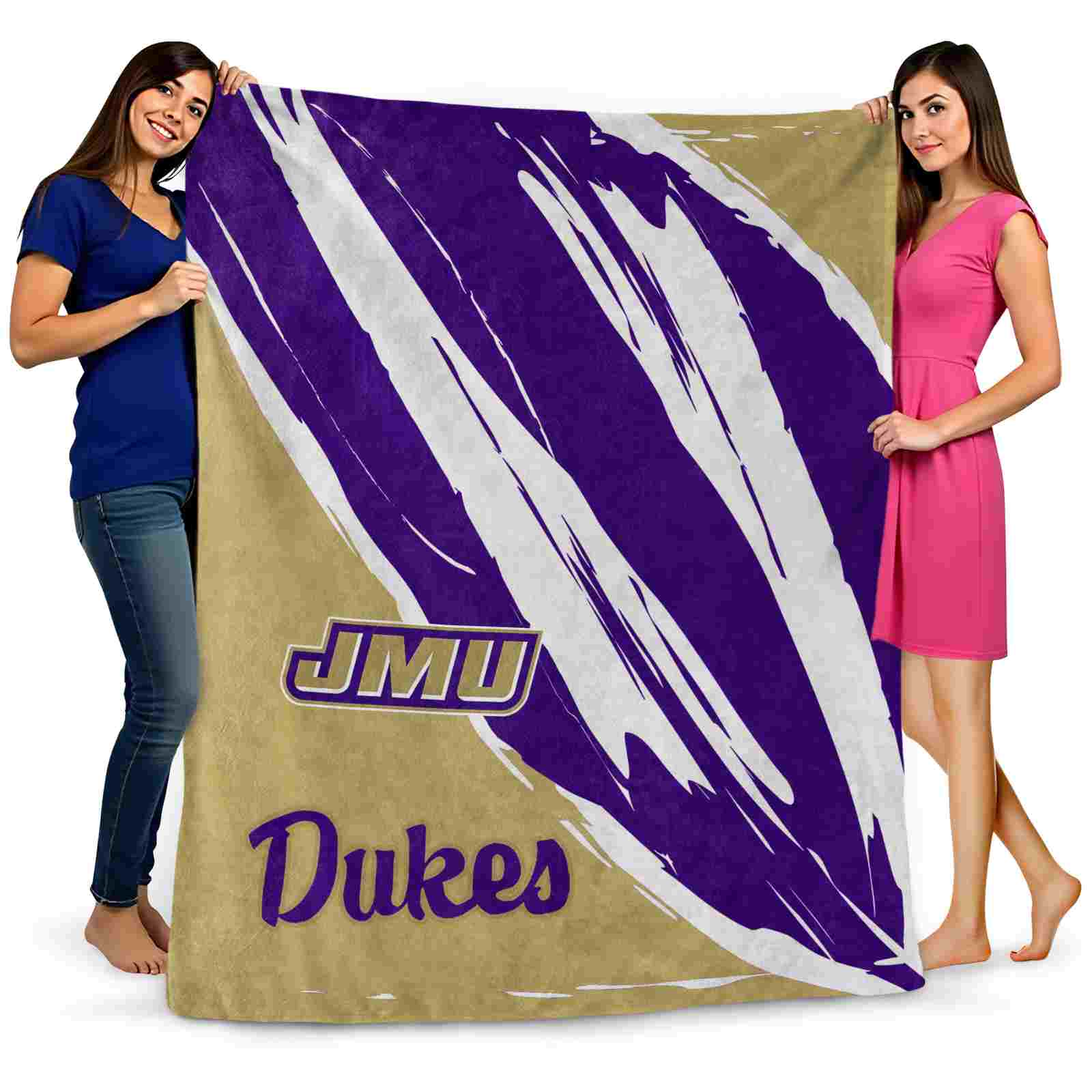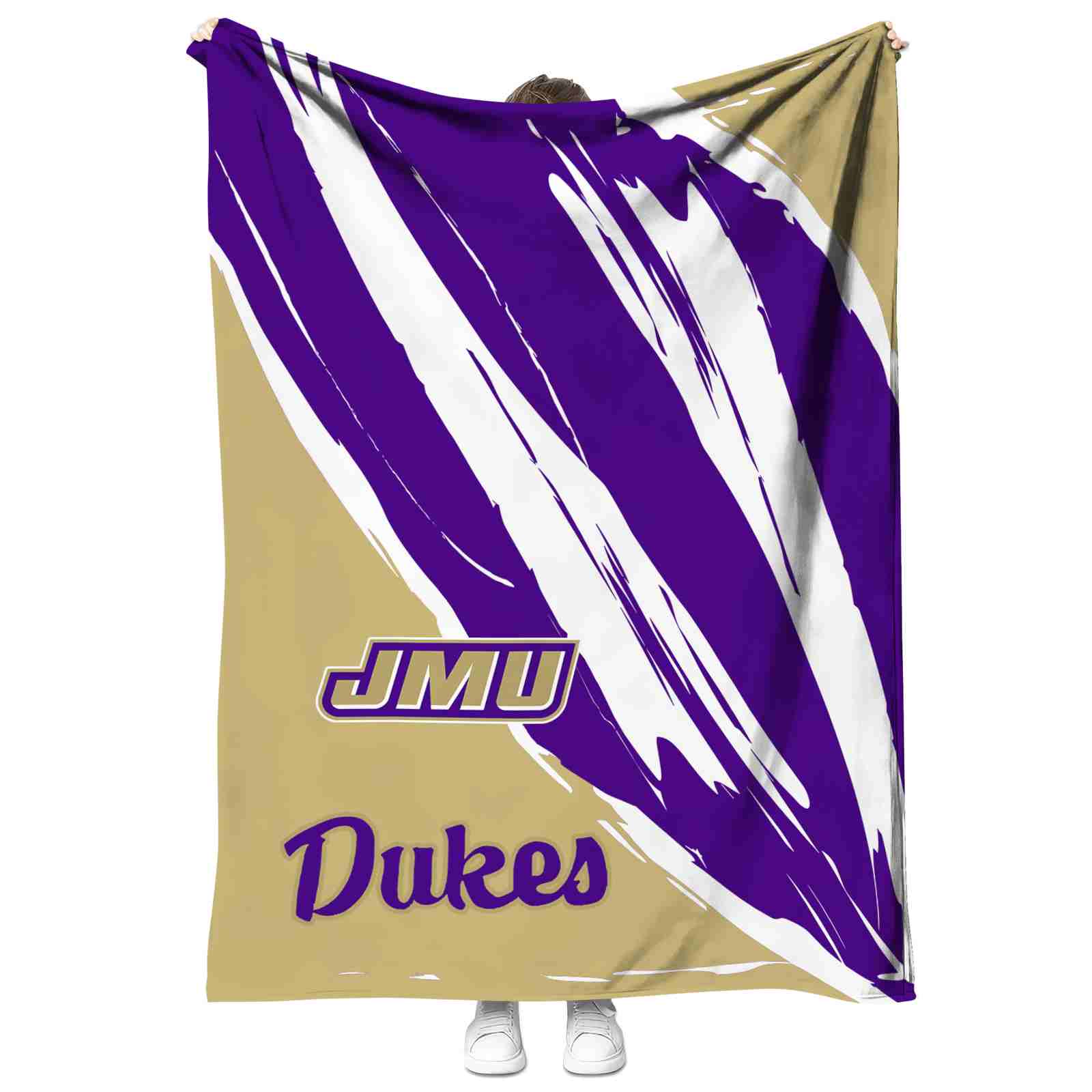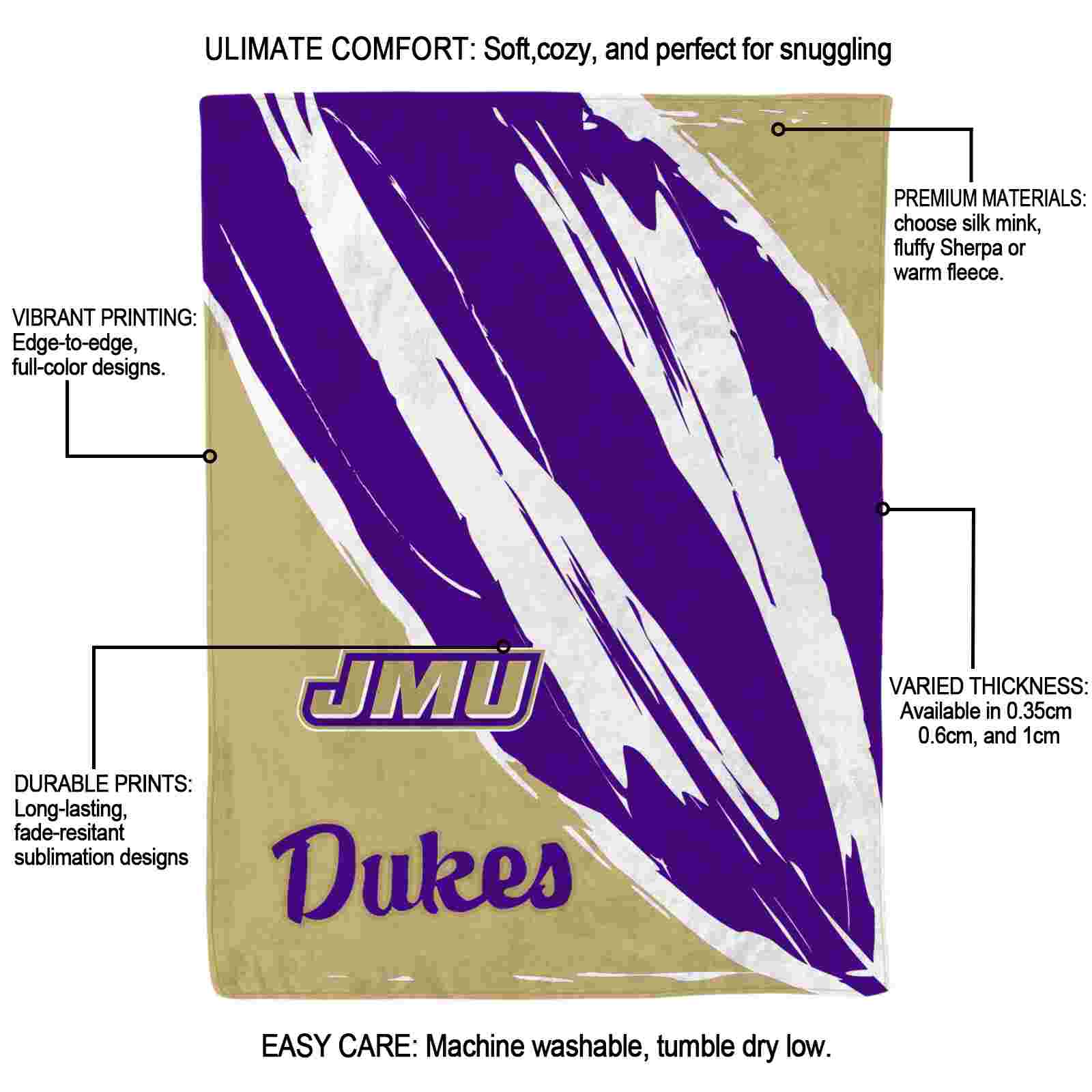 Without a doubt, the James Madison Dukes Brushstrokes Purple White Blanket from James Madison Dukes Blankets collection is offering true fans a chance to showcase passion in a cool way. Personalize it with your favorite team's logo or a meaningful name to make it uniquely yours. Isn't that great? The full-color print ensures vibrant, edge-to-edge designs, bringing your sports enthusiasm to life!