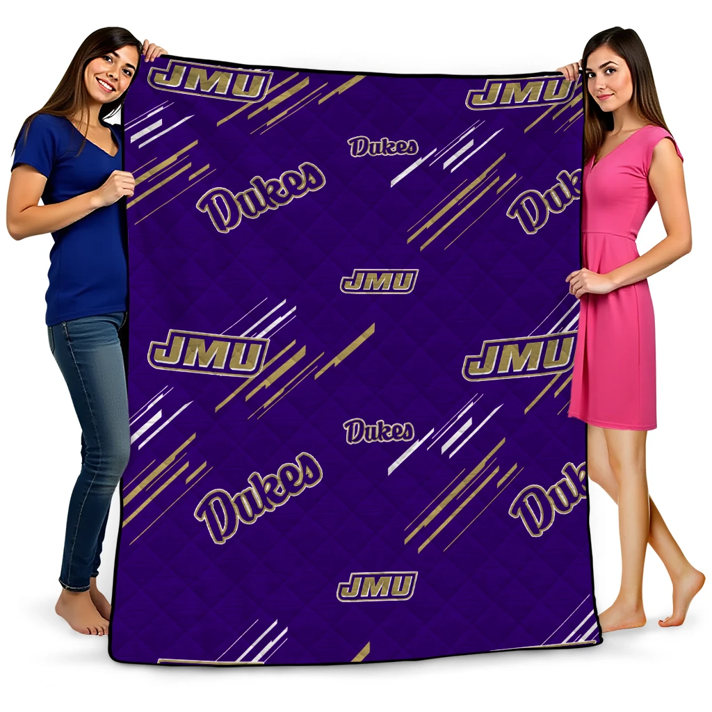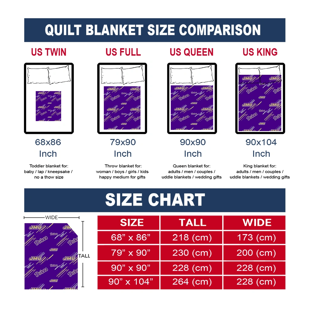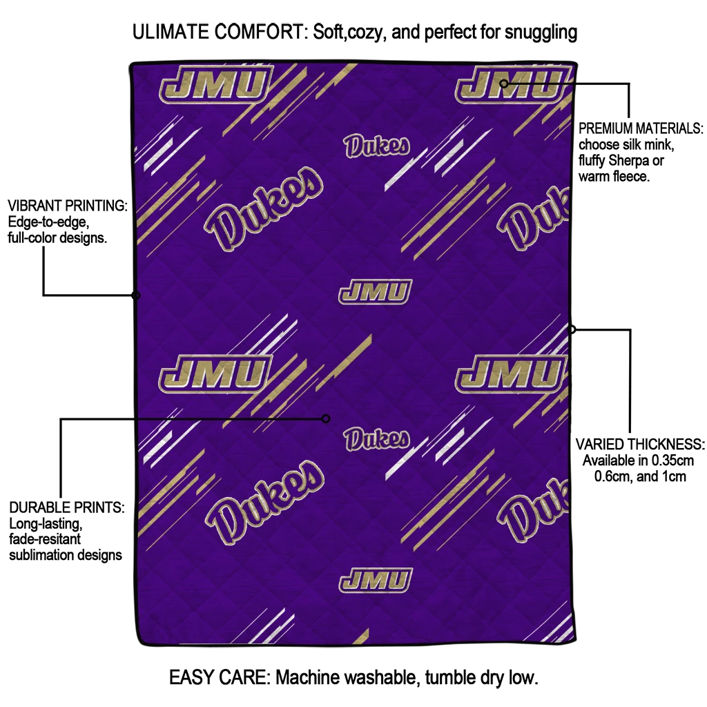 Wrap yourself in warmth and pride with the James Madison Dukes Sketch Lines Purple Quilt Blanket from the James Madison Dukes Blankets collection at Yes That Blanket. Made from 100% premium quilting-weight polyester blended with a touch of microfiber, this quilt offers a smooth, soft finish you’ll love. Choose between two quilting styles—Stipple or Diagonal—and enjoy the comfort of a cotton-filled layer inside that adds extra coziness for every season. The border is available in classic black or white, giving your design a clean, timeless edge.