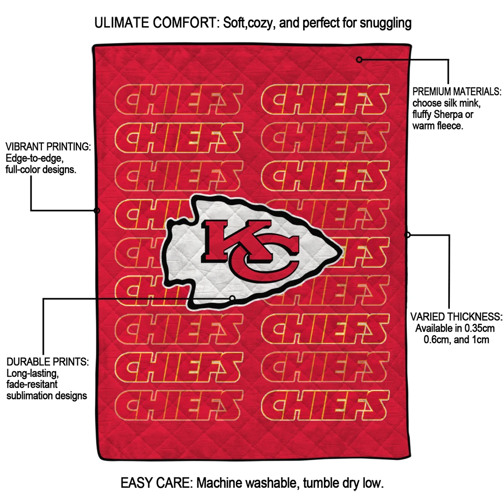 The Kansas City Chiefs Bold Red Quilt Blanket is more than a blanket—it’s everyday comfort, thoughtfully made. Crafted from premium quilting fabric with a soft microfiber touch, it offers a smooth hand-feel and lasting coziness. Layered quilting with a cotton-filled core provides adaptable warmth across seasons while maintaining a clean, tailored look on your bed or sofa.