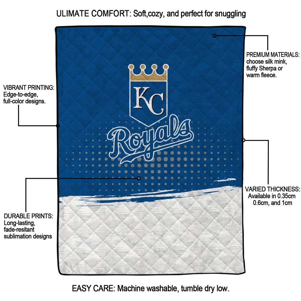 Wrap yourself in warmth and pride with the Kansas City Royals Dot Illusion Royal Blue Quilt Blanket from the Kansas City Royals Blankets collection at Yes That Blanket. Made from 100% premium quilting-weight polyester blended with a touch of microfiber, this quilt offers a smooth, soft finish you’ll love. Choose between two quilting styles—Stipple or Diagonal—and enjoy the comfort of a cotton-filled layer inside that adds extra coziness for every season. The border is available in classic black or white, giving your design a clean, timeless edge.