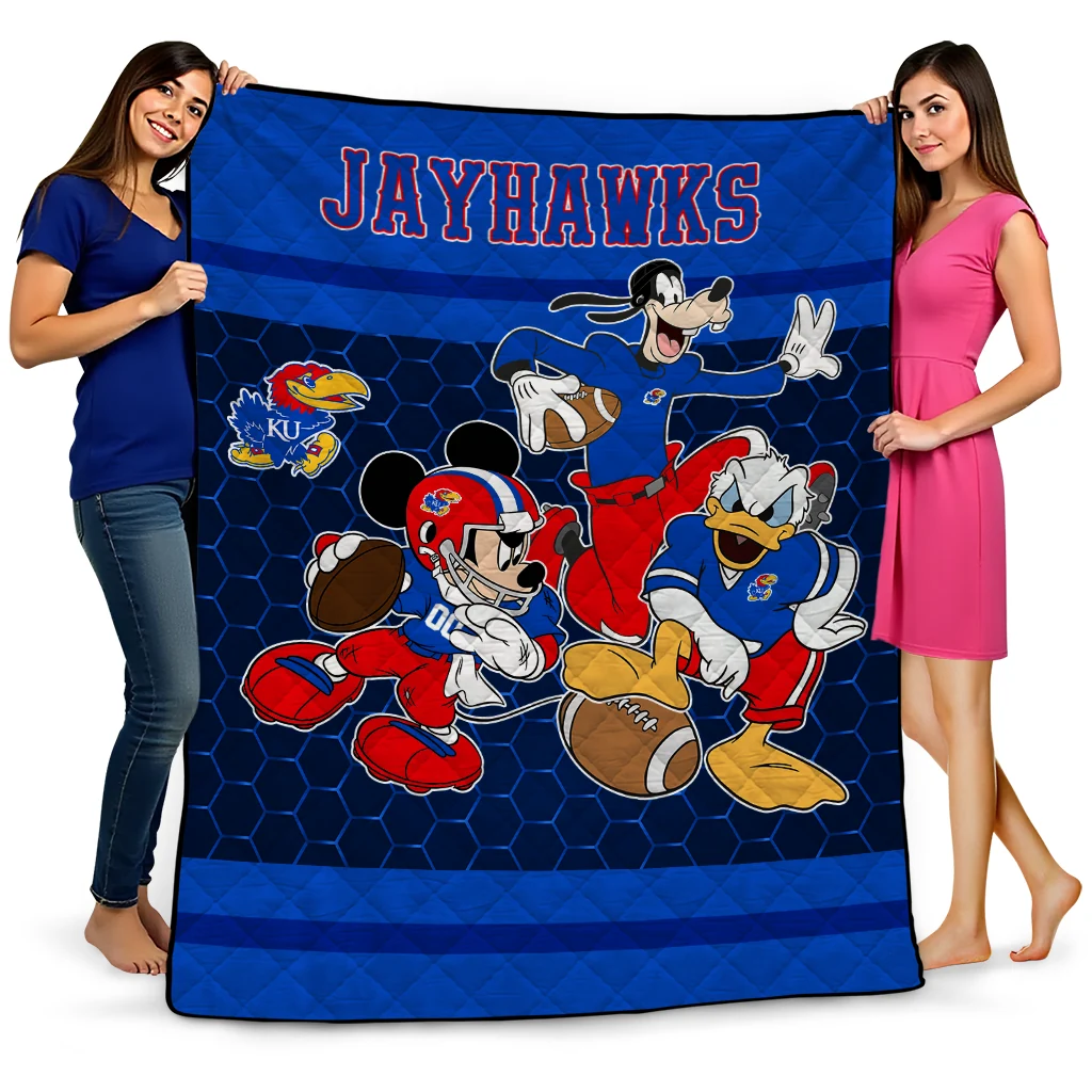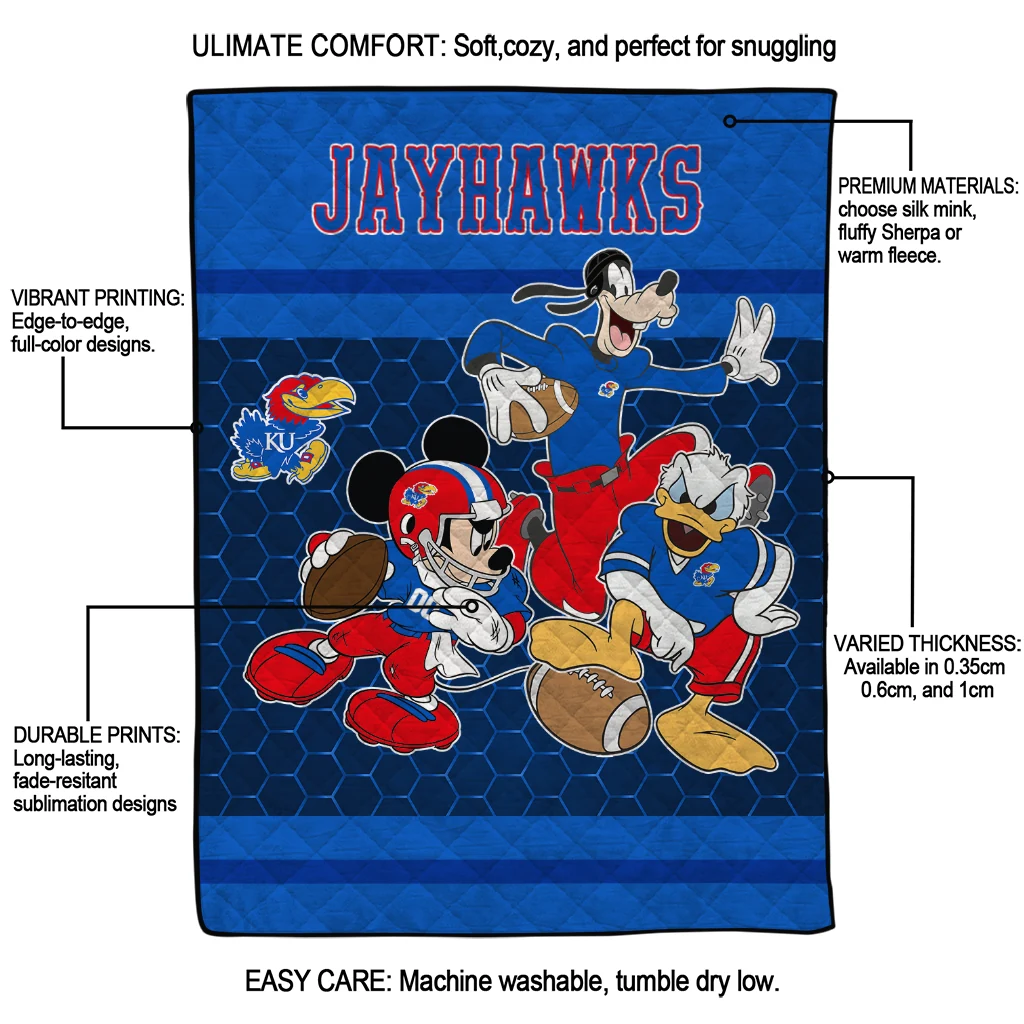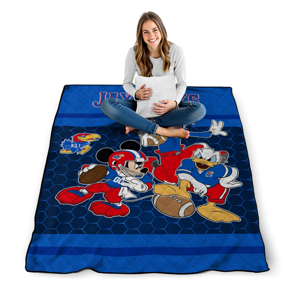 Wrap yourself in warmth and pride with the Kansas Jayhawks Disney Football Blue Quilt Blanket from the Kansas Jayhawks Blankets collection at Yes That Blanket. Made from 100% premium quilting-weight polyester blended with a touch of microfiber, this quilt offers a smooth, soft finish you’ll love. Choose between two quilting styles—Stipple or Diagonal—and enjoy the comfort of a cotton-filled layer inside that adds extra coziness for every season. The border is available in classic black or white, giving your design a clean, timeless edge.