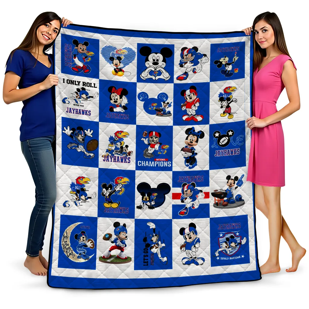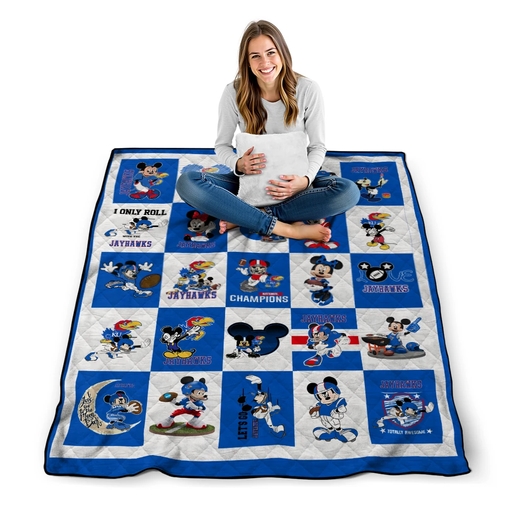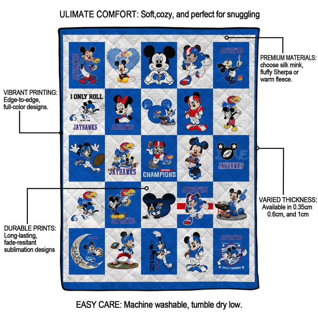 Kansas Jayhawks Mickey Mouse Motif Blue White Quilt Blanket