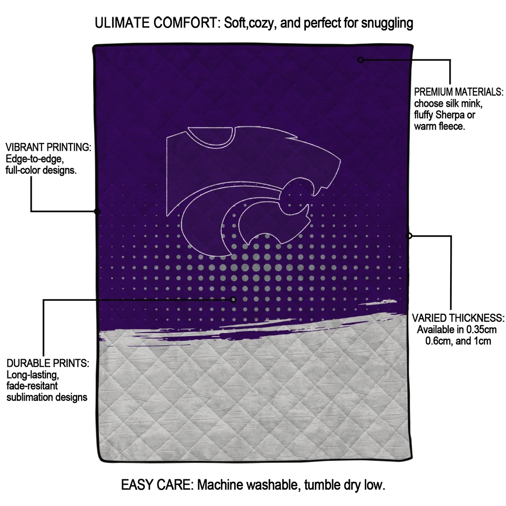 Wrap yourself in warmth and pride with the Kansas State Wildcats Dot Illusion Purple Quilt Blanket from the Kansas State Wildcats Blankets collection at Yes That Blanket. Made from 100% premium quilting-weight polyester blended with a touch of microfiber, this quilt offers a smooth, soft finish you’ll love. Choose between two quilting styles—Stipple or Diagonal—and enjoy the comfort of a cotton-filled layer inside that adds extra coziness for every season. The border is available in classic black or white, giving your design a clean, timeless edge.