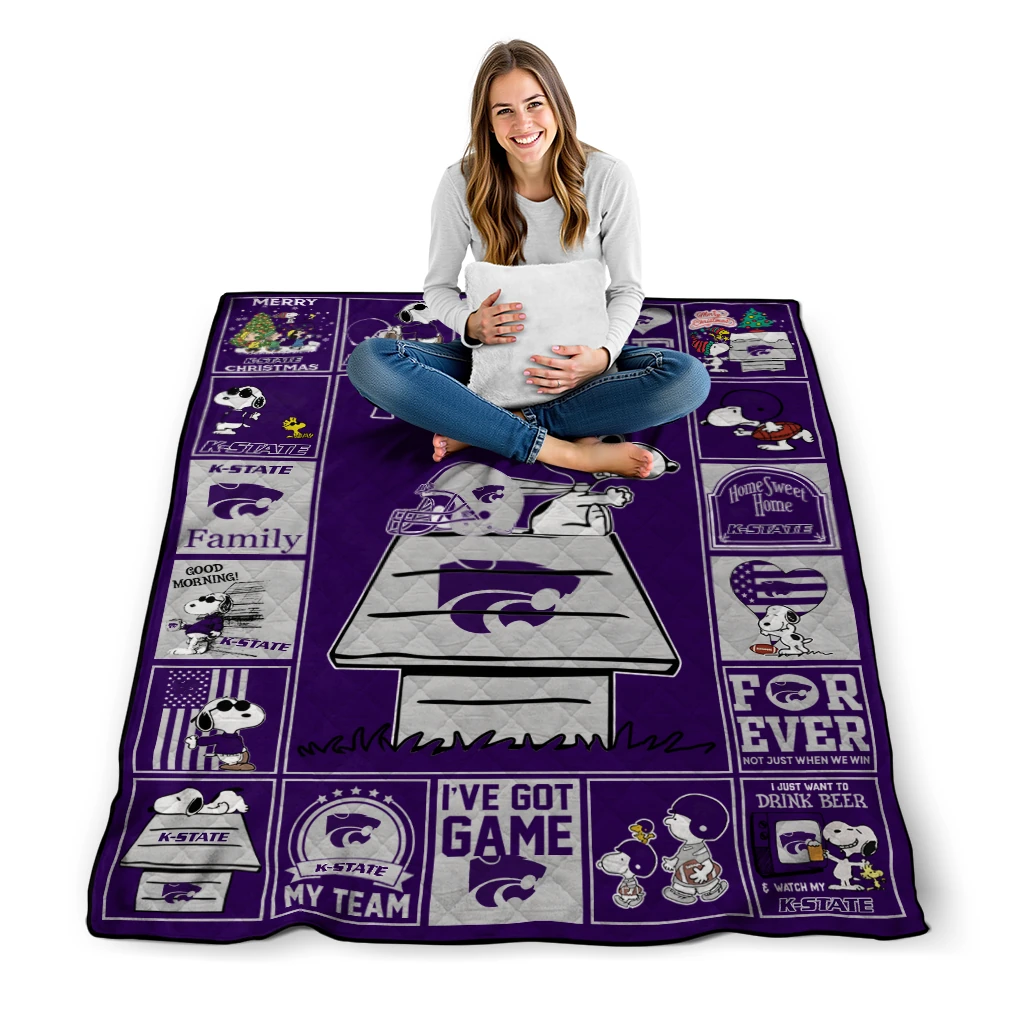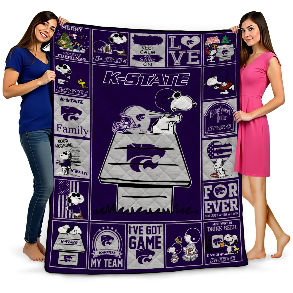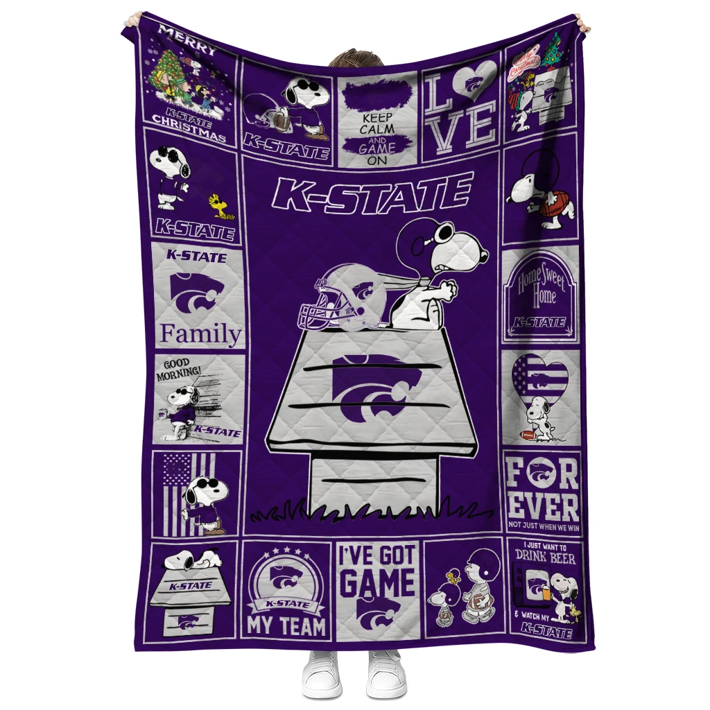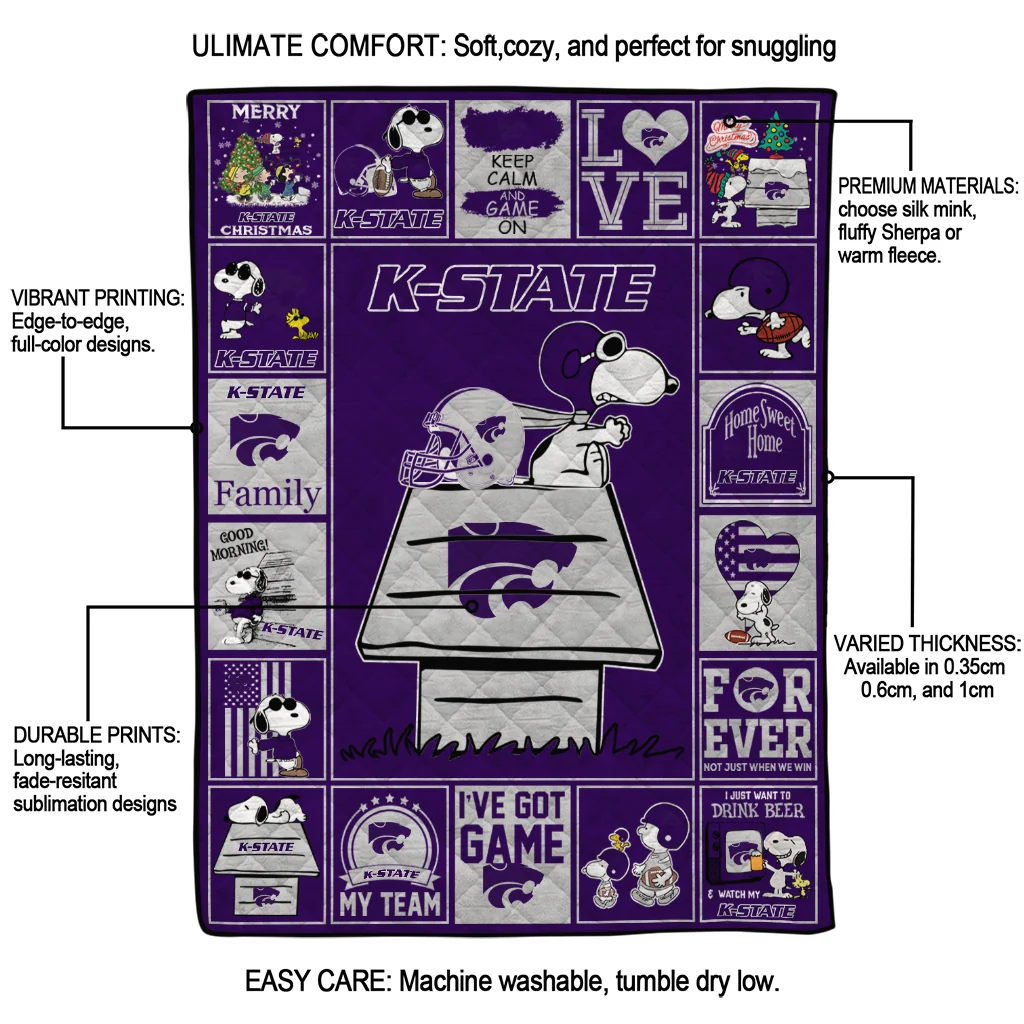 Wrap yourself in warmth and pride with the Kansas State Wildcats Snoopy Love Purple Quilt Blanket from the Kansas State Wildcats Blankets collection at Yes That Blanket. Made from 100% premium quilting-weight polyester blended with a touch of microfiber, this quilt offers a smooth, soft finish you’ll love. Choose between two quilting styles—Stipple or Diagonal—and enjoy the comfort of a cotton-filled layer inside that adds extra coziness for every season. The border is available in classic black or white, giving your design a clean, timeless edge.