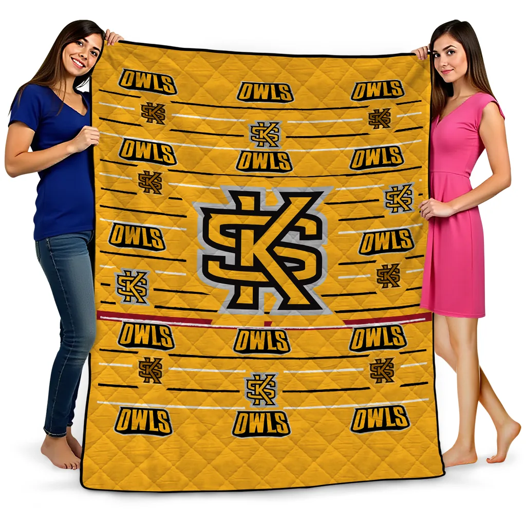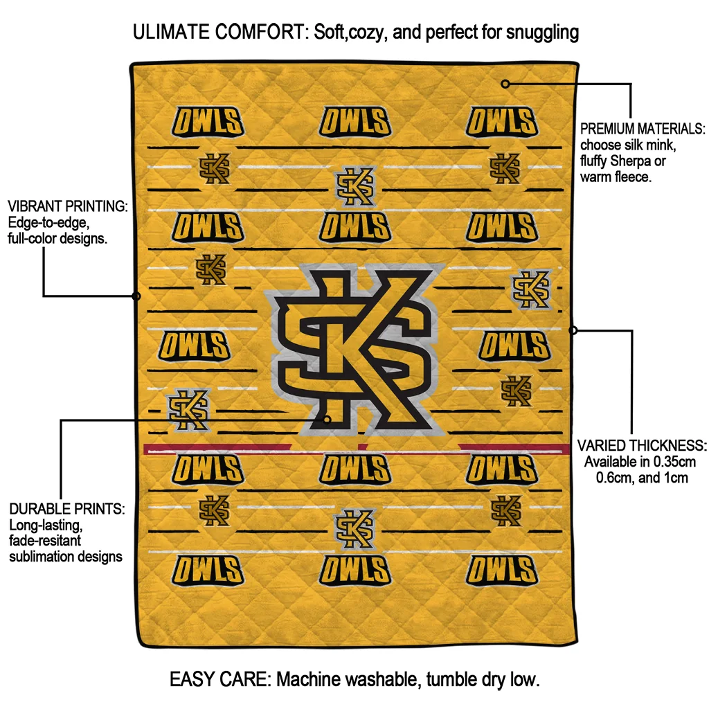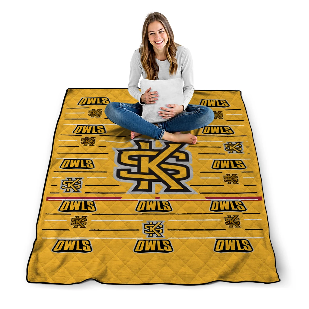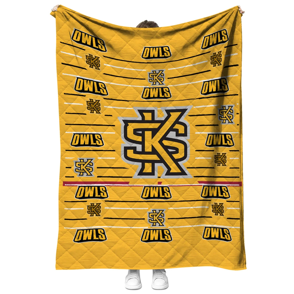 Wrap yourself in warmth and pride with the Kennesaw State Owls Handdrawn Stripes Gold Quilt Blanket from the Kennesaw State Owls Blankets collection at Yes That Blanket. Made from 100% premium quilting-weight polyester blended with a touch of microfiber, this quilt offers a smooth, soft finish you’ll love. Choose between two quilting styles—Stipple or Diagonal—and enjoy the comfort of a cotton-filled layer inside that adds extra coziness for every season. The border is available in classic black or white, giving your design a clean, timeless edge.
