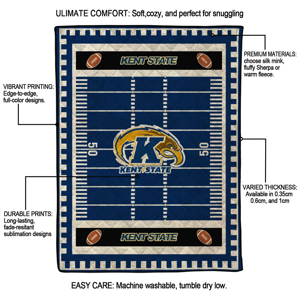 Wrap yourself in warmth and pride with the Kent State Golden Flashes Mickey Player Navy Blue Quilt Blanket from the Kent State Golden Flashes Blankets collection at Yes That Blanket. Made from 100% premium quilting-weight polyester blended with a touch of microfiber, this quilt offers a smooth, soft finish you’ll love. Choose between two quilting styles—Stipple or Diagonal—and enjoy the comfort of a cotton-filled layer inside that adds extra coziness for every season. The border is available in classic black or white, giving your design a clean, timeless edge.
