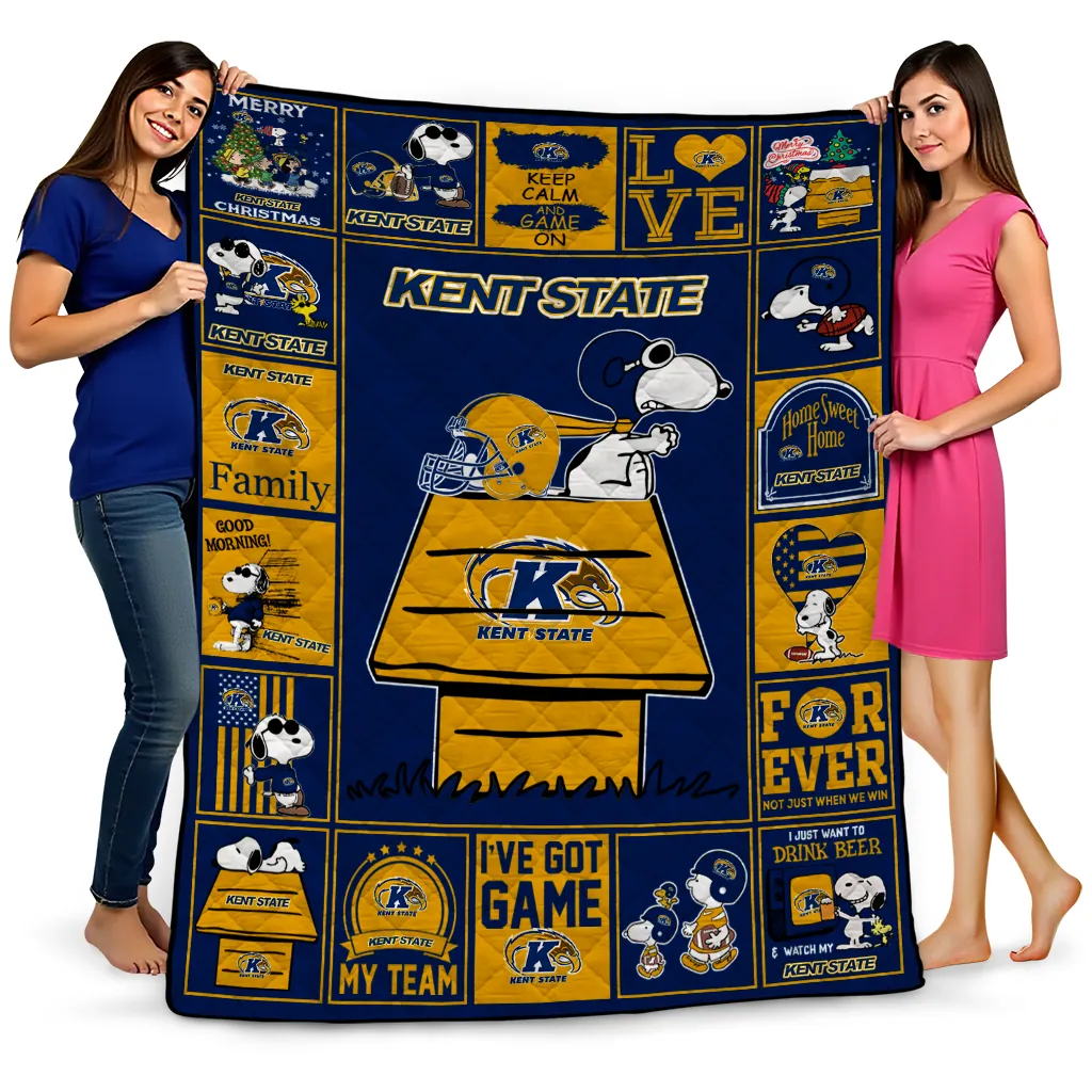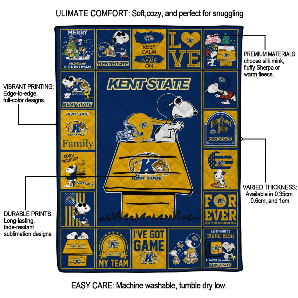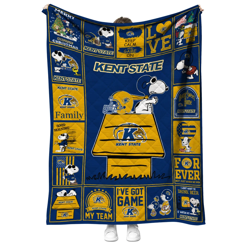 Wrap yourself in warmth and pride with the Kent State Golden Flashes Snoopy Love Navy Blue Quilt Blanket from the Kent State Golden Flashes Blankets collection at Yes That Blanket. Made from 100% premium quilting-weight polyester blended with a touch of microfiber, this quilt offers a smooth, soft finish you’ll love. Choose between two quilting styles—Stipple or Diagonal—and enjoy the comfort of a cotton-filled layer inside that adds extra coziness for every season. The border is available in classic black or white, giving your design a clean, timeless edge.