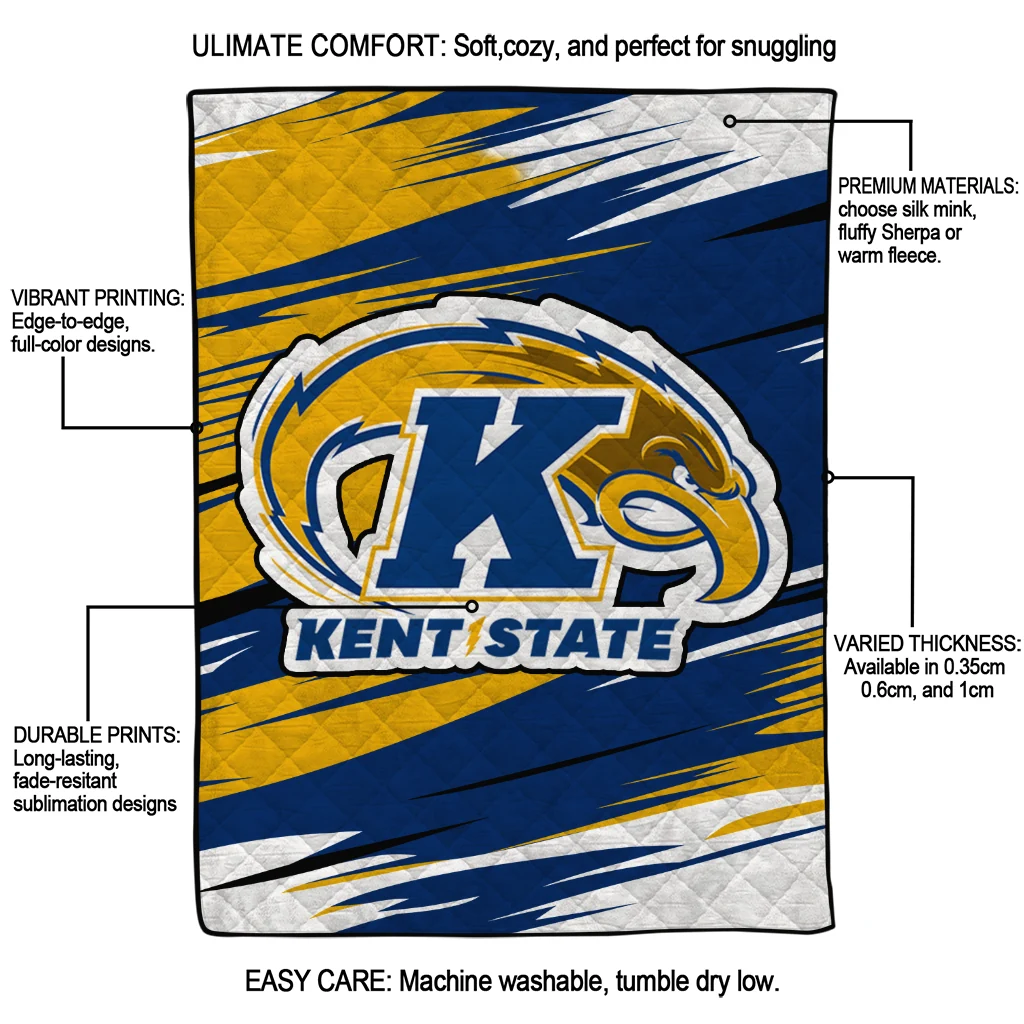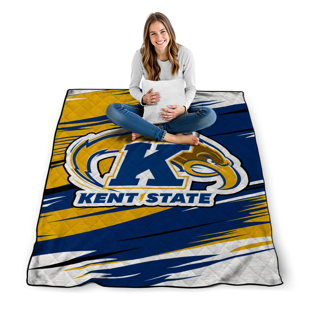 Wrap yourself in warmth and pride with the Kent State Golden Flashes Wild Lines Navy Blue White Quilt Blanket from the Kent State Golden Flashes Blankets collection at Yes That Blanket. Made from 100% premium quilting-weight polyester blended with a touch of microfiber, this quilt offers a smooth, soft finish you’ll love. Choose between two quilting styles—Stipple or Diagonal—and enjoy the comfort of a cotton-filled layer inside that adds extra coziness for every season. The border is available in classic black or white, giving your design a clean, timeless edge.