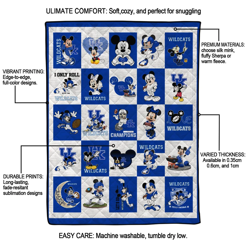 Wrap yourself in warmth and pride with the Kentucky Wildcats Mickey Mouse Motif Blue White Quilt Blanket from the Kentucky Wildcats Blankets collection at Yes That Blanket. Made from 100% premium quilting-weight polyester blended with a touch of microfiber, this quilt offers a smooth, soft finish you’ll love. Choose between two quilting styles—Stipple or Diagonal—and enjoy the comfort of a cotton-filled layer inside that adds extra coziness for every season. The border is available in classic black or white, giving your design a clean, timeless edge.