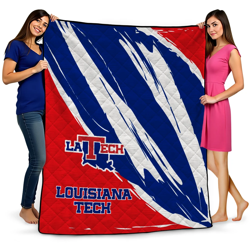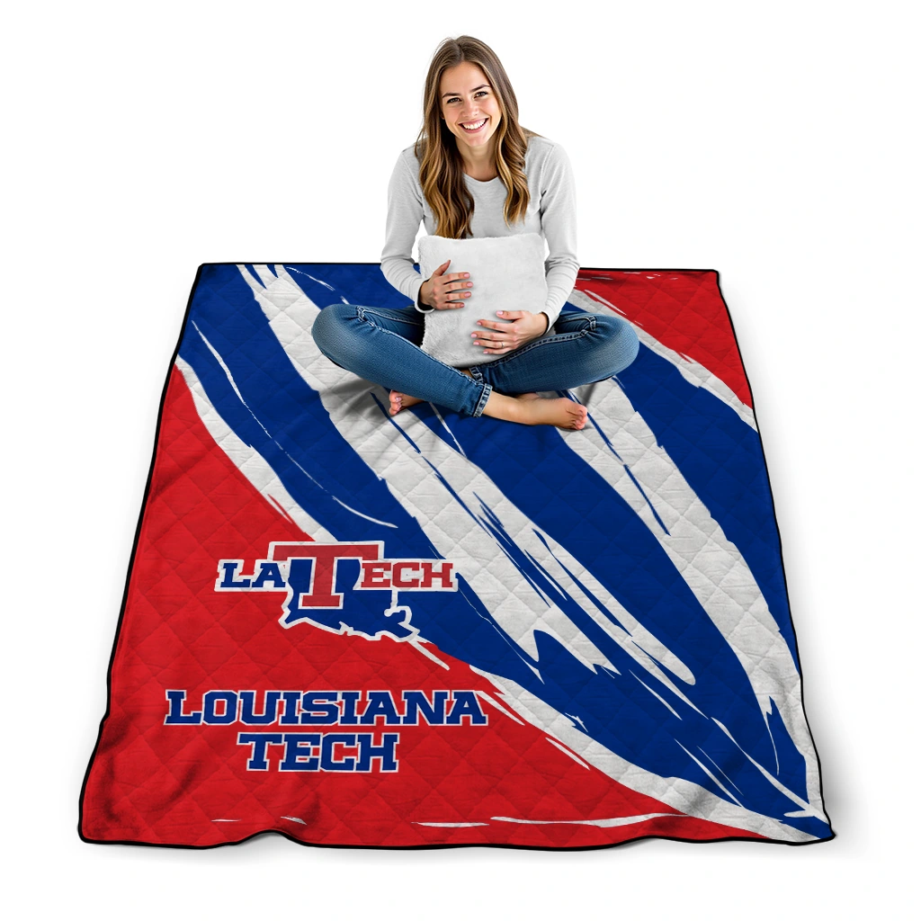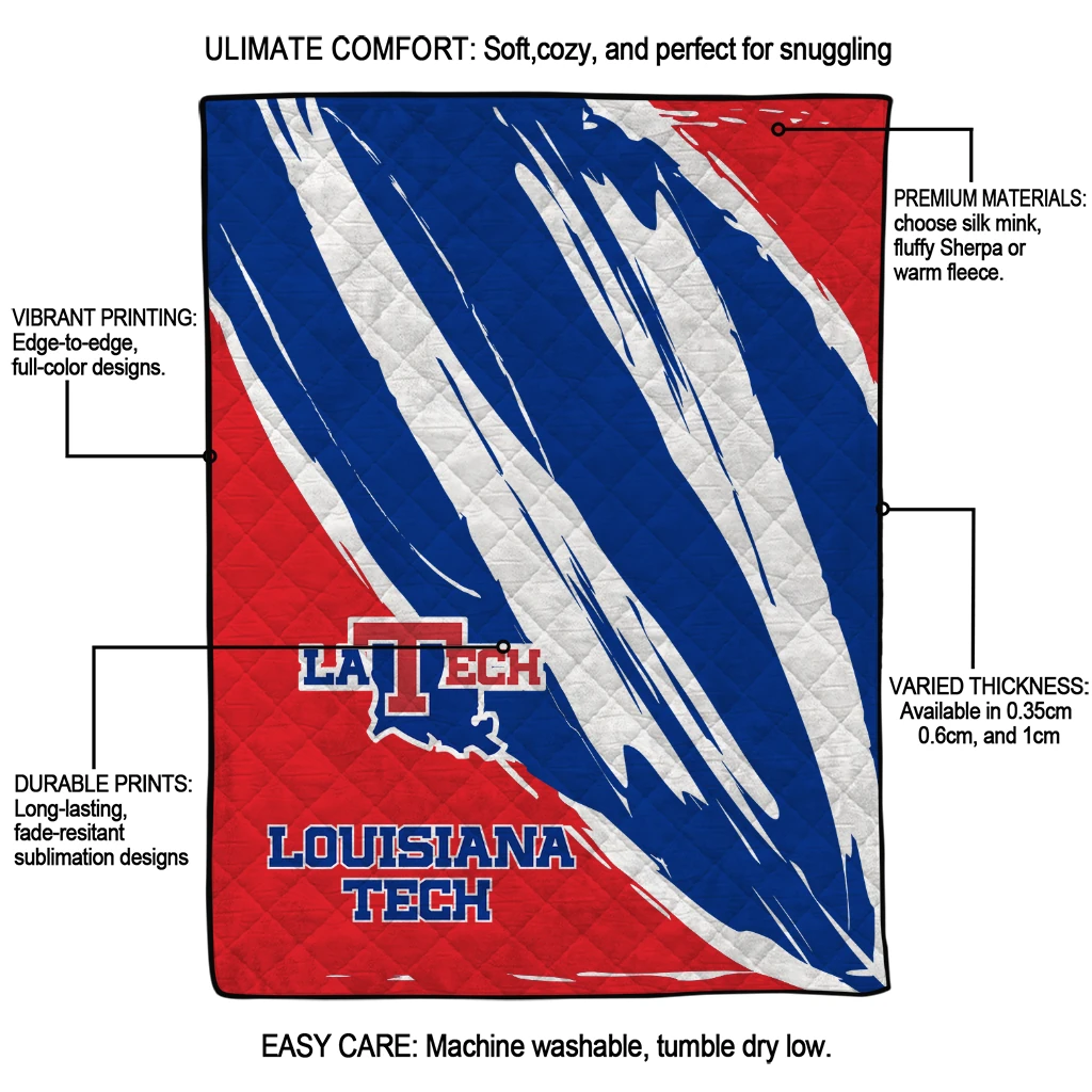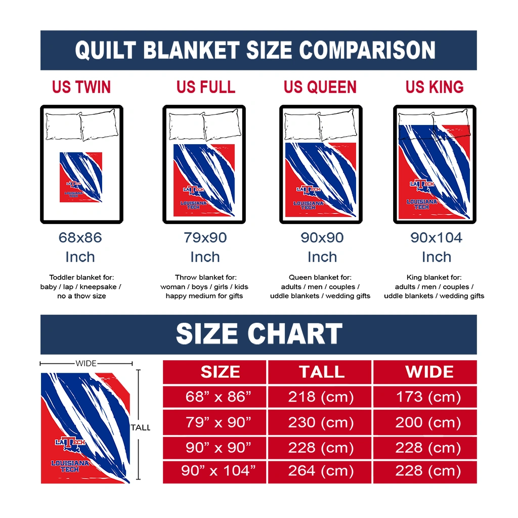 Wrap yourself in warmth and pride with the LA Tech Stroke Art Blue White Quilt Blanket from the LA Tech Blankets collection at Yes That Blanket. Made from 100% premium quilting-weight polyester blended with a touch of microfiber, this quilt offers a smooth, soft finish you’ll love. Choose between two quilting styles—Stipple or Diagonal—and enjoy the comfort of a cotton-filled layer inside that adds extra coziness for every season. The border is available in classic black or white, giving your design a clean, timeless edge.