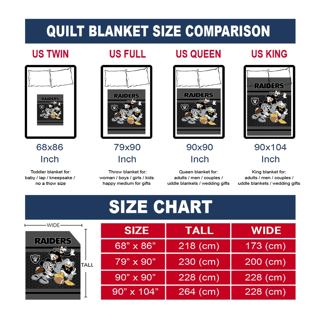 Wrap yourself in warmth and pride with the Las Vegas Raiders Disney Football Black Quilt Blanket from the Las Vegas Raiders Blankets collection at Yes That Blanket. Made from 100% premium quilting-weight polyester blended with a touch of microfiber, this quilt offers a smooth, soft finish you’ll love. Choose between two quilting styles—Stipple or Diagonal—and enjoy the comfort of a cotton-filled layer inside that adds extra coziness for every season. The border is available in classic black or white, giving your design a clean, timeless edge.